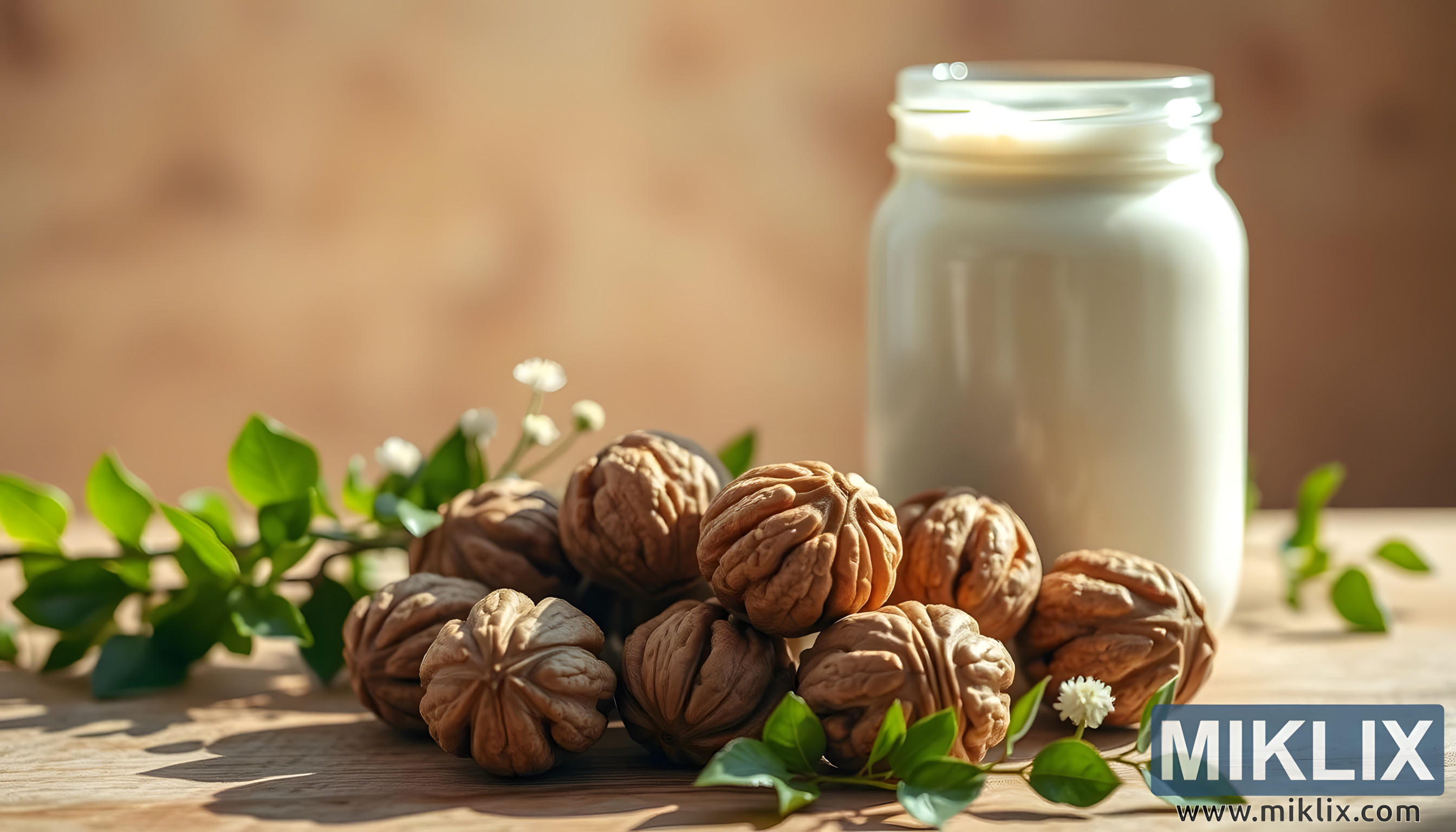 Natureza-morta de tom terroso de nozes com videiras frondosas e iogurte de noz, simbolizando seus benefícios probióticos e papel no apoio ao bem-estar digestivo.