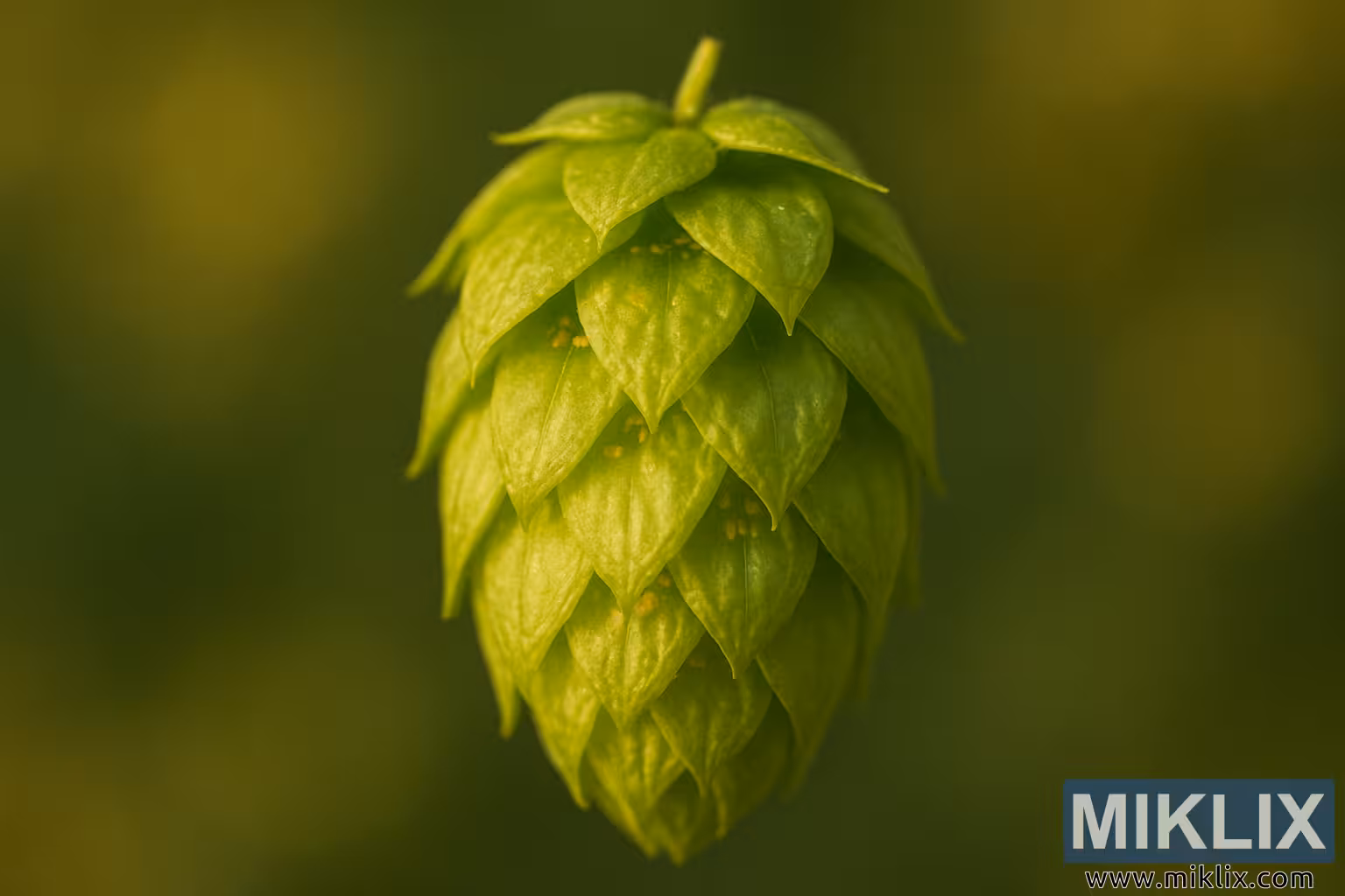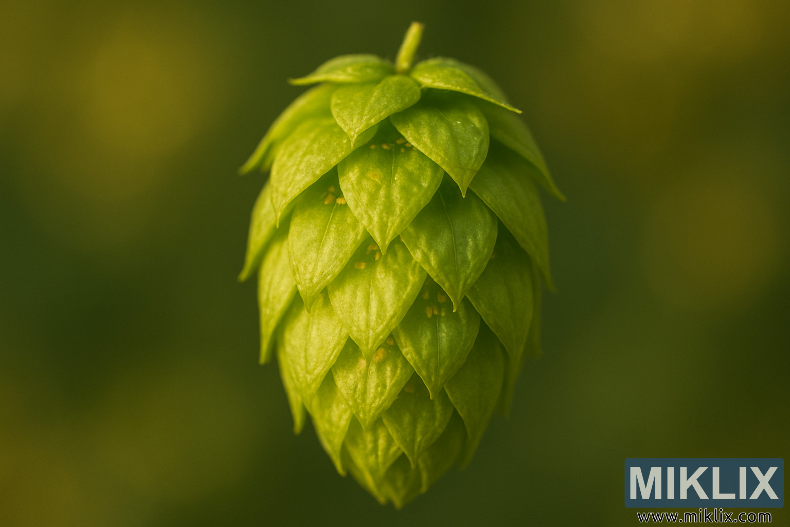 Imaginea prezintă un prim-plan fascinant al unui singur con de hamei, surprins în detalii deosebite și iluminat de o lumină caldă și blândă. Suspendat pe un fundal verde-auriu estompat, estompat, conul este punctul focal incontestabil, strălucind de vitalitate și textură. Forma sa este tridimensională și sculpturală, cu bractee suprapuse, aranjate într-un model spiralat natural, care seamănă cu stratificarea solzilor sau a petalelor delicate. Fiecare bractă se subțiază într-un punct subtil, curbându-se ușor spre privitor și conferind conului o prezență dinamică, aproape arhitecturală.