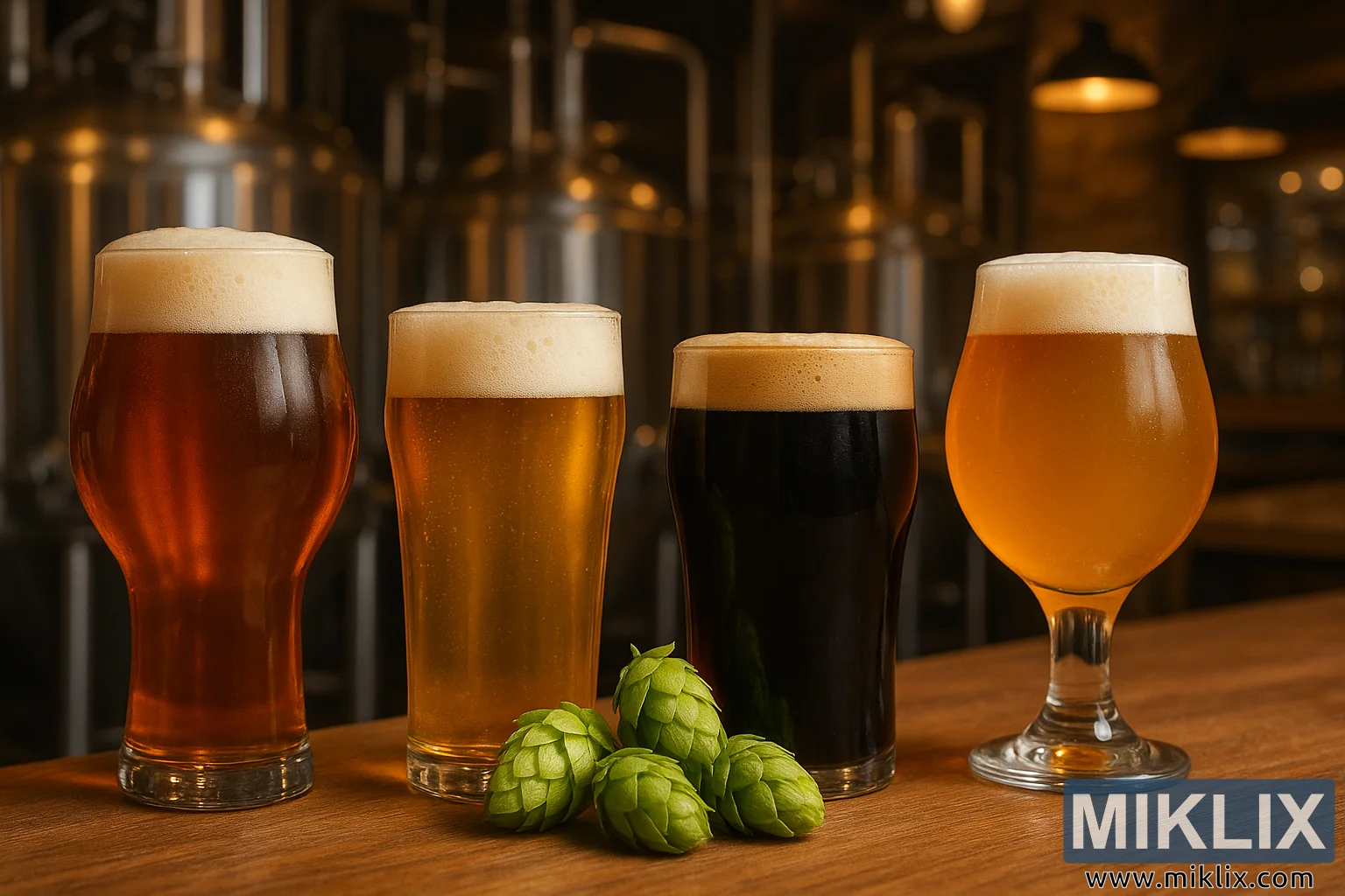 Imaginea surprinde o scenă caldă și primitoare în interiorul unei berării artizanale, unde măiestria fabricării berii se întâlnește cu frumusețea senzorială a prezentării. Compoziția este centrată pe patru pahare de bere distincte, aranjate într-un rând ordonat pe o suprafață rustică din lemn. Fiecare pahar prezintă un stil diferit de bere, subliniind diversitatea și versatilitatea hameiului Banner, deoarece acesta contribuie la o gamă largă de arome și arome.