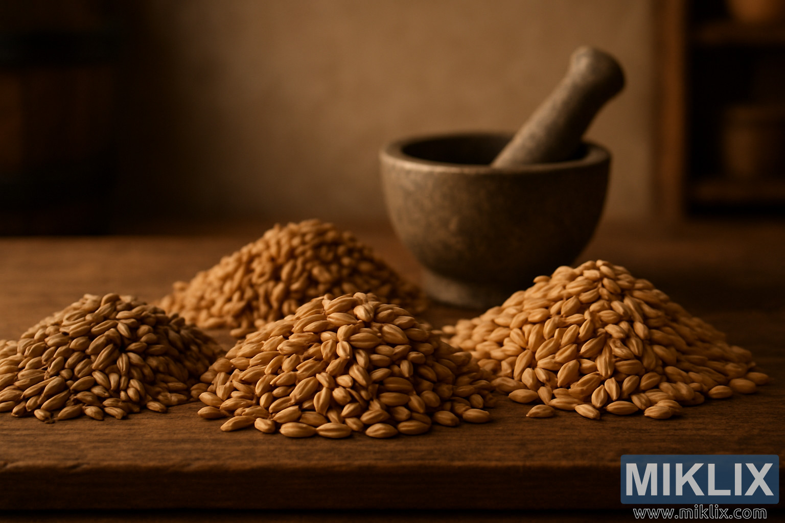 Natură statică caldă cu înlocuitori de malț, cum ar fi secară, orz și grâu, cu mojar și pistil, într-o scenă rustică de meșteșug inspirată de fabricarea berii.