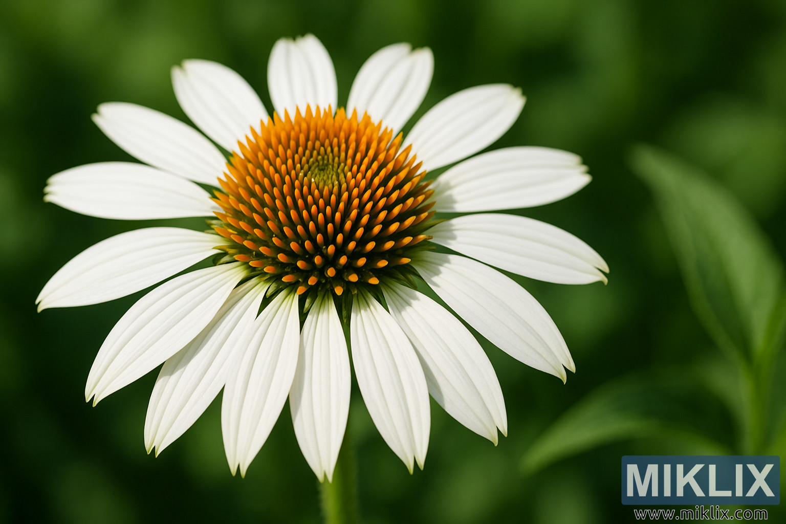 Imaginea prezintă un prim-plan deosebit al unei echinacee purpurea 'White Swan' (Echinacea purpurea 'White Swan') în plină floare, surprinzând simplitatea elegantă și frumusețea rafinată a acestei plante perene îndrăgite. Cadrul este dominat de o singură floare imaculată, clar focalizată, a cărei formă este perfect simetrică și radiază grație naturală. Petalele - albe pur și delicat alungite - se extind din centru spre exterior ca o stea, ușor atârnate la vârfuri în silueta caracteristică a echinaceei. Suprafața lor este fin texturată, cu nervuri longitudinale slabe, adăugând o senzație subtilă de structură și profunzime aspectului moale și mătăsos. Fiecare petală se subțiază până la un vârf fin, creând un echilibru rafinat, aproape arhitectural, între moliciune și precizie.