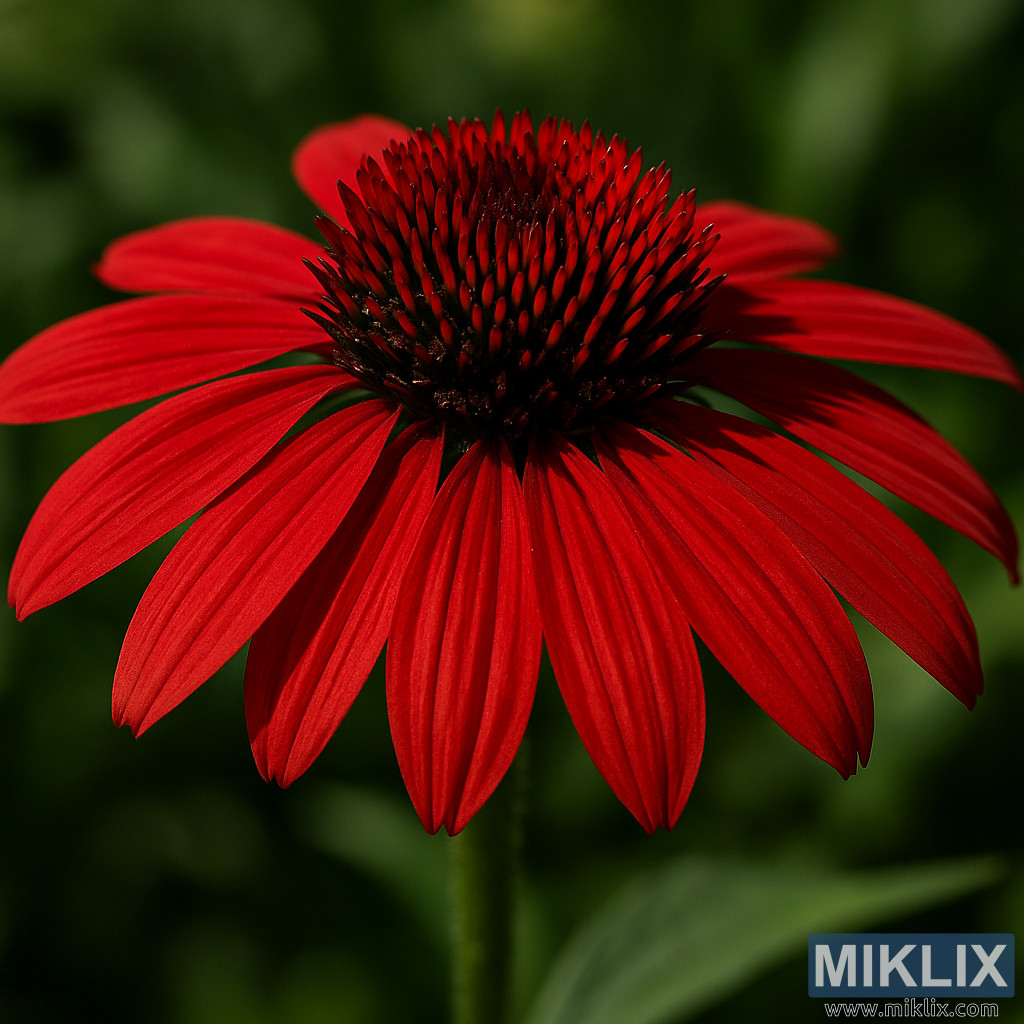 Imaginea surprinde un prim-plan deosebit al unei echinacee roșii Sombrero Salsa (Echinacea), o varietate celebrată pentru colorația sa îndrăzneață, aprinsă și prezența izbitoare în grădină. Floarea domină compoziția, prezentată cu detalii clare și intensitate luminoasă pe un fundal verde închis, ușor estompat. Petalele sale roșii, bogate și saturate, radiază spre exterior din conul central într-un cerc aproape perfect, fiecare petală alungită elegant și ușor lăsată, o caracteristică a formei de echinacee. Petalele prezintă variații subtile de nuanță - de la un stacojiu intens lângă bază la un purpuriu mai pal la vârfuri - și nervuri liniare fine care adaugă o dimensiune texturală delicată suprafeței lor mătăsoase.