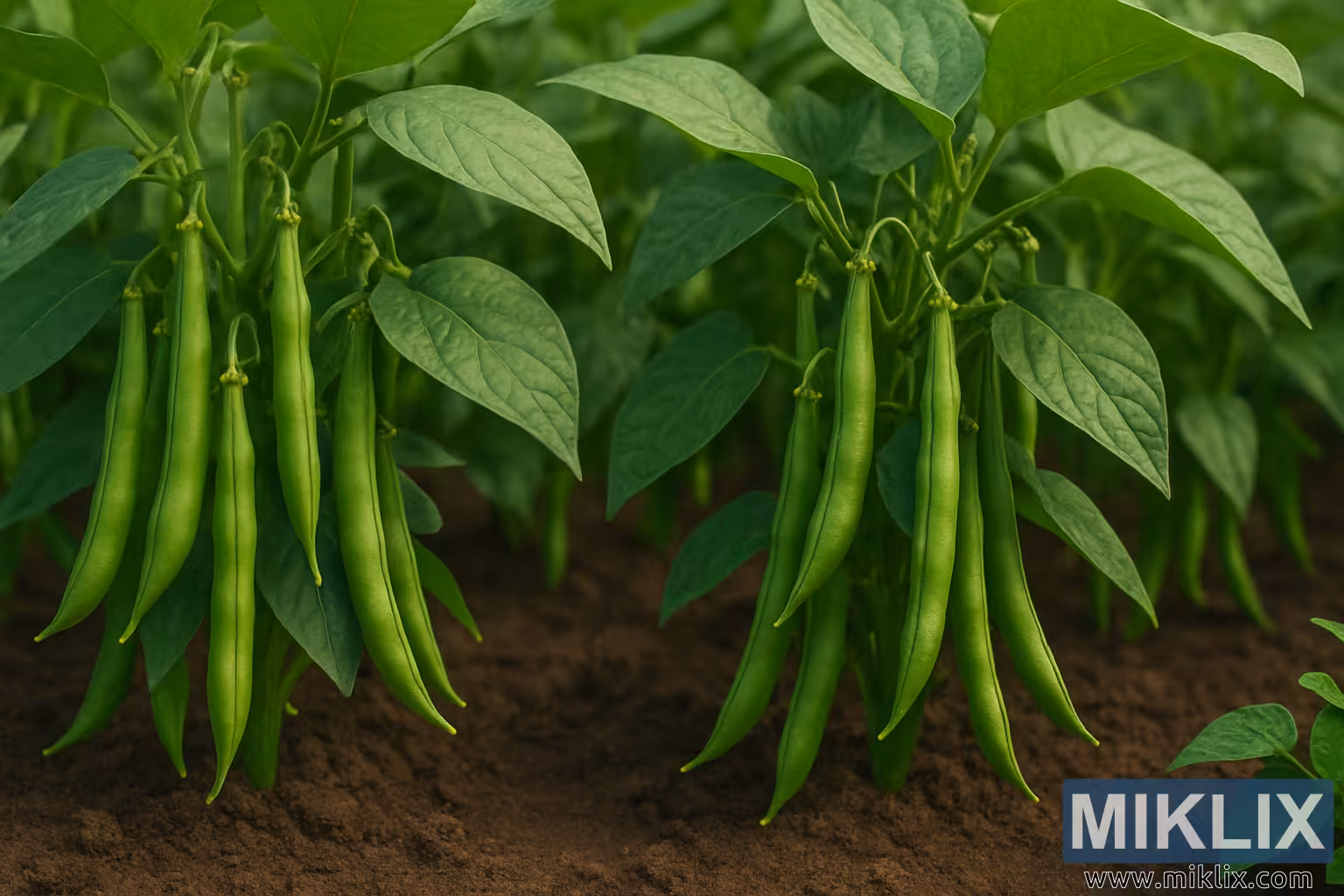 Plante de fasole verde vibrante, cu păstăi subțiri și frunze dense, care cresc în sol bogat, evidențiate de lumina naturală blândă a soarelui.