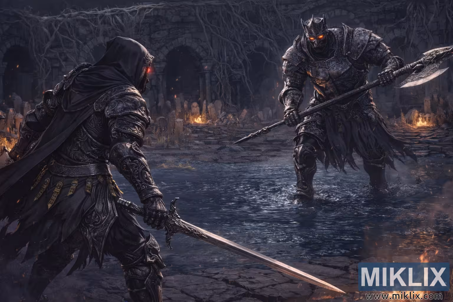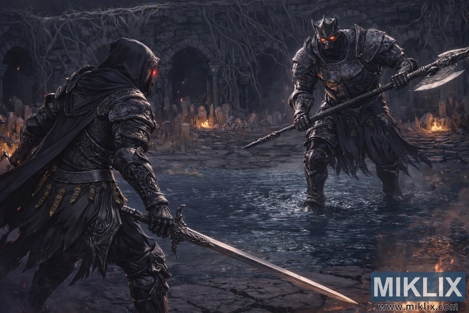 Ilustrație anime detaliată, realizată de fani, care înfățișează o confruntare tensionată înainte de luptă între un spadasin cu glugă și armură de umbră și un cavaler impunător înarmat cu o halebardă, într-o arenă întunecată și în ruine, plină de apă, lumină de foc și ceață.