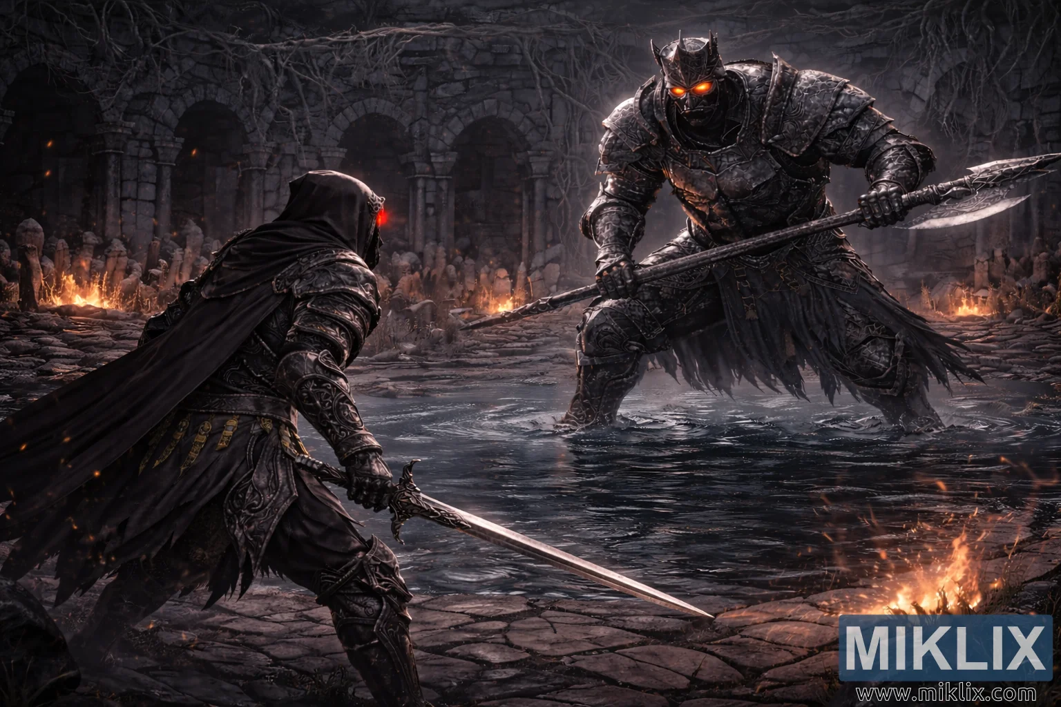 O operă de artă anime fantasy cu vedere panoramică, care prezintă un războinic cu glugă și o sabie înfruntând un șef gigantic de halebardă blindată într-o ruină întunecată și inundată, cu momente înainte de începerea luptei.