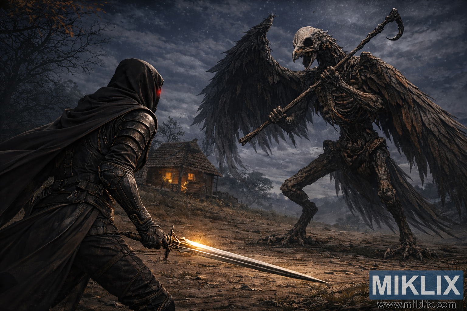 Operă de artă fantezie întunecată și sumbră, inspirată de Elden Ring, care îi înfățișează pe Tarnished mânuind o sabie împotriva unui șef gigantic Deathbird lângă o colibă de lemn strălucitoare sub un cer furtunos.