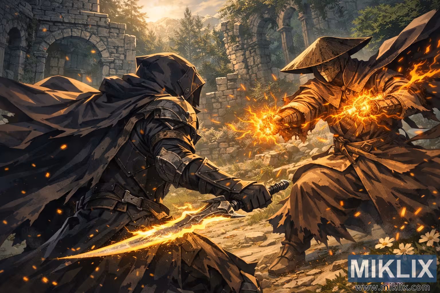 Fiecare element al compoziției atrage privirea spre spațiul dintre cele două figuri: linia diagonală a lamei strălucitoare a lui Tarnished, lovitura înainte a pumnilor arzători ai lui Dryleaf Dane și particulele învolburate suspendate în aer. Stilul general, inspirat de anime, exagerează mișcarea și iluminarea, folosind linii clare, texturi picturale și luminoase cu contrast ridicat pentru a face confruntarea să pară epică și imediată, ca și cum următoarea bătaie a inimii ar decide rezultatul duelului.
