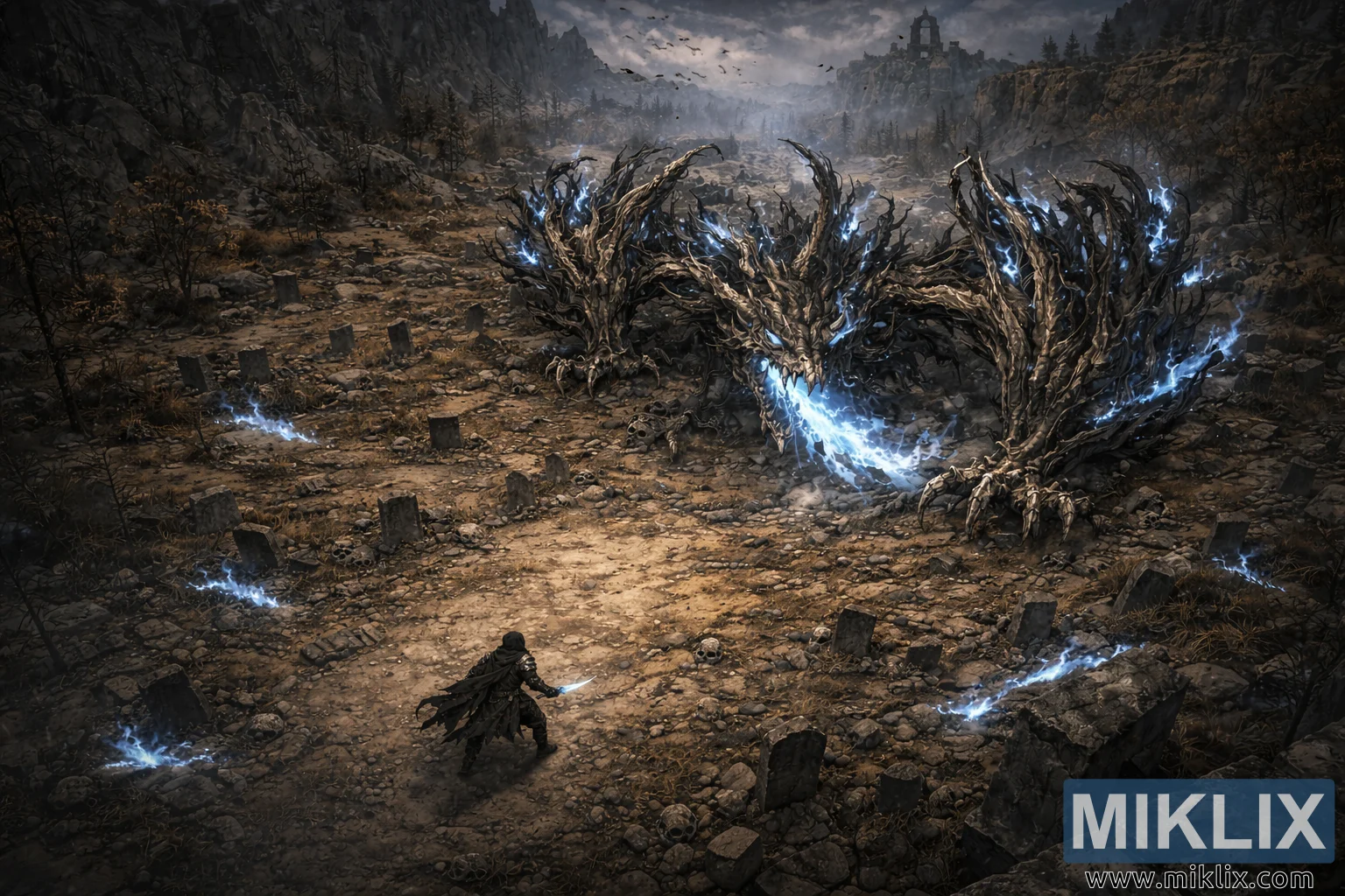 Flacăra fantomă își croiește o dâră luminoasă prin fundul văii prăfuite, luminând cranii, pietre funerare prăbușite și cioburi de piatră în calea sa. Dâre subțiri de reziduuri albastre persistă în urma exploziei, ca niște cicatrici de degerături pe pământ. În jurul câmpului de luptă, sute de pietre funerare ies din pământ în unghiuri inegale, creând o grilă haotică ce face ca Terenul să pară și mai mic prin comparație. Stâncile din jur se înalță abrupt de ambele părți, înconjurând confruntarea precum zidurile unei arene colosale. Mult dincolo de dragon, abia vizibilă prin straturile de ceață, o structură în ruine încoronează o creastă îndepărtată, sugerând o civilizație uitată, acum redusă la un martor tăcut.