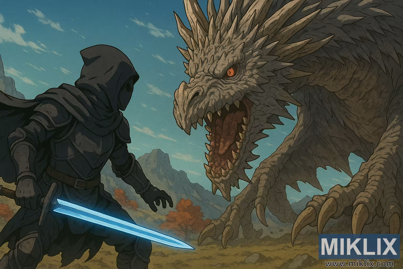 Окружающая среда обрамляет схватку пустынной тишиной, контрастирующей с динамичной, яростной энергией сражающихся. Драконий курган простирается вдаль, его скалистые холмы и далёкие горы омываются прохладными синими тонами под ясным небом. Осенне-красные деревья разбросаны по ландшафту, их листья нежны и безмолвны на фоне ярости момента. Пыль и грязь разлетаются рядом с когтями Грейолла, намекая на недавнее движение — возможно, перед атакой или сразу после защитного отступления.