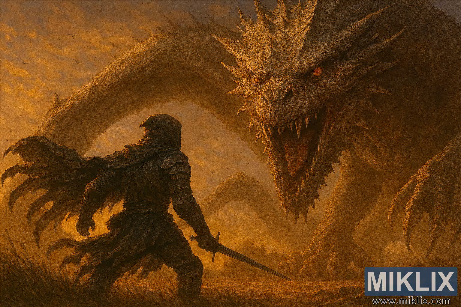 Детализированная, живописная цифровая работа запечатлела драматическое противостояние Потускневшего и Древнего дракона Грейолла в Драконьем кургане из Elden Ring. Реалистичное изображение с атмосферным освещением и тонкими текстурами передаёт масштаб, напряжение и величие этой знаковой встречи.