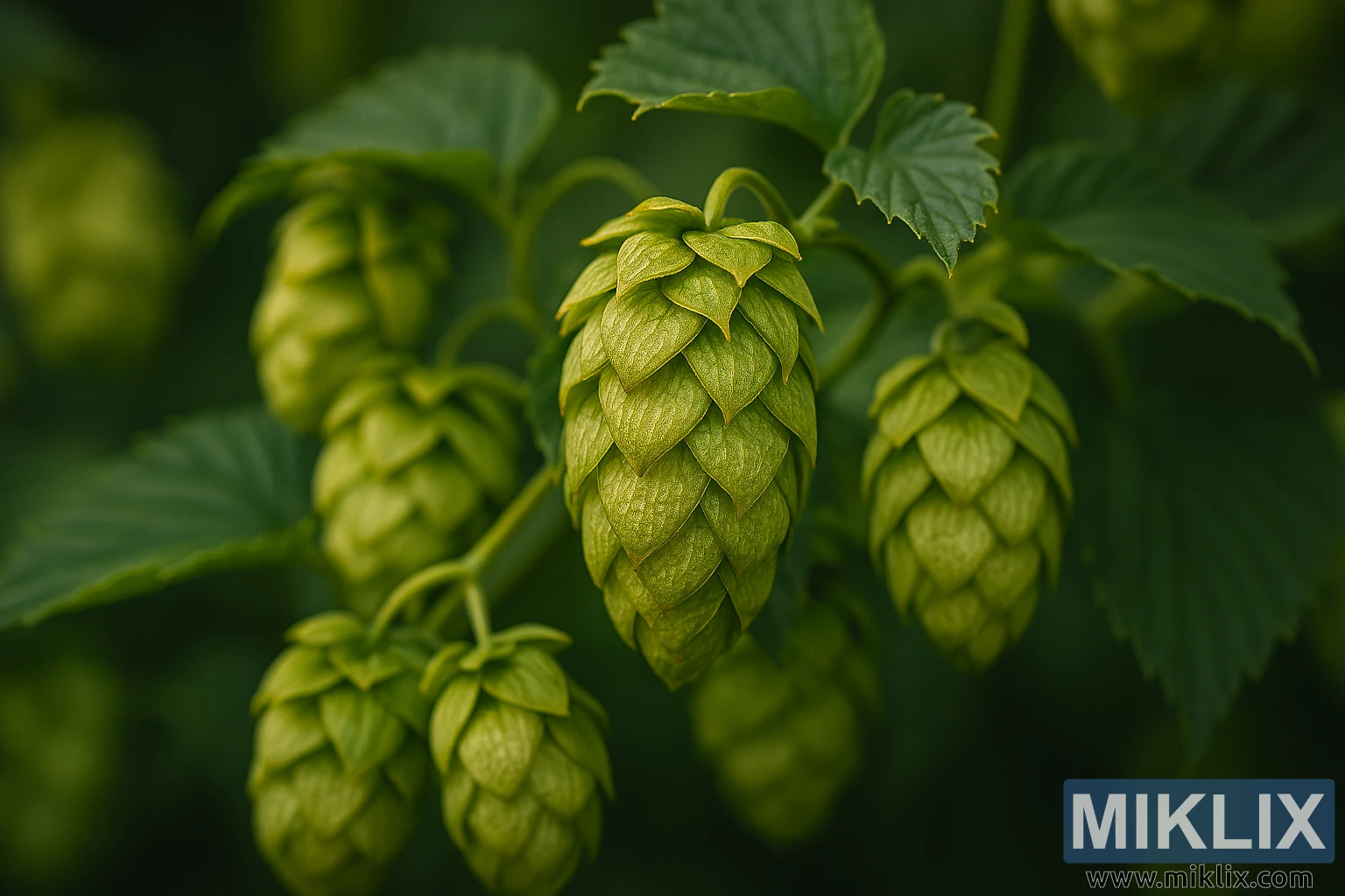 Это изображение ландшафта высокого разрешения представляет собой визуально насыщенное и ботанически точное изображение шишек хмеля сорта Premiant, которые славятся своей сбалансированной горечью и изысканным ароматом в пивоварении. В центре композиции – плотно сгруппированные шишки хмеля, каждая из которых передана с исключительной прозрачностью и текстурой. Их конические формы образованы перекрывающимися прицветниками – бумажистыми, похожими на лепестки образованиями, мерцающими тонкими золотисто-янтарными оттенками. Эти оттенки указывают на богатый, сложный вкусовой профиль, который сорт Premiant придаёт крафтовому пиву, варьируясь от цветочных и травянистых до слегка пряных.