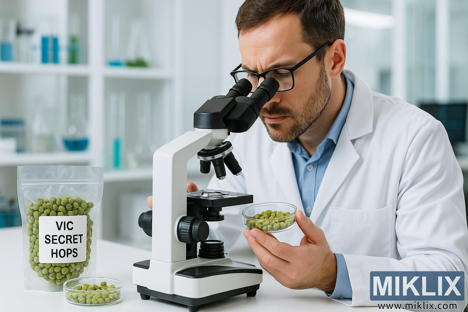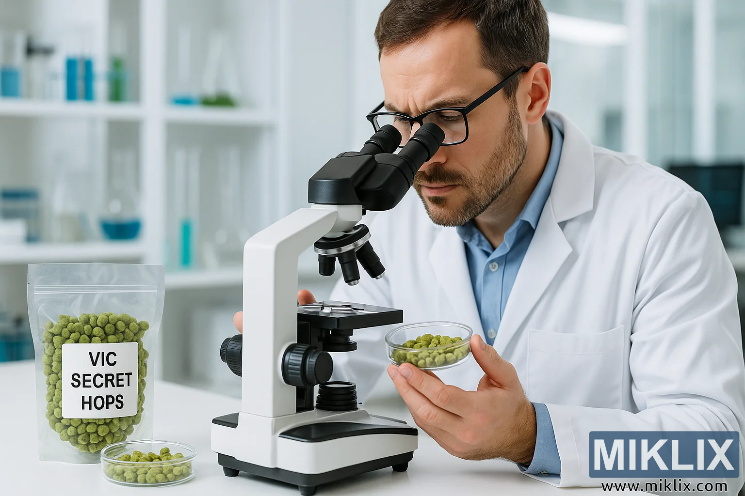 Рабочий стол перед ним аккуратный и чистый, отражающий контролируемую, профессиональную лабораторную обстановку. Слева от микроскопа лежит герметичный пластиковый пакет с четкой надписью «Vic Secret Hops». Пакет наполнен зелеными гранулами хмеля одинакового размера, а рядом с ним стоит небольшая чашка Петри с дополнительными гранулами. Гранулы хмеля выглядят яркими и фактурными, визуально подчеркивая их ботаническое происхождение и важность в пивоварении.