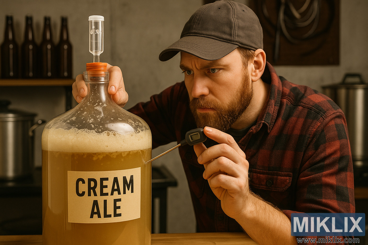 Бутыль герметично закрыта резиновой пробкой с гидрозатвором, в котором видны жидкость и пузырьки газа, что свидетельствует о продолжающемся выделении CO₂. Большая бежевая этикетка с надписью «CREAM ALE» прикреплена к передней части сосуда, придавая сцене чёткое ощущение цели и организованности, типичной для скрупулезных домашних пивоваров. На заднем плане изображены ряды пустых янтарных пивных бутылок на полке, варочный котел из нержавеющей стали, свернутые шланги и различные пивоваренные инструменты, которые придают аутентичность обстановке. Сочетание нержавеющей стали, стекла и тёплых деревянных тонов создаёт ощущение мастерства, а верхнее освещение подчёркивает сосредоточенность пивовара и текстуру бродящего пива. Сцена отражает как технические, так и ремесленные аспекты пивоварения, передавая пристальное внимание, терпение и практическое взаимодействие, которых требует стадия ферментации.