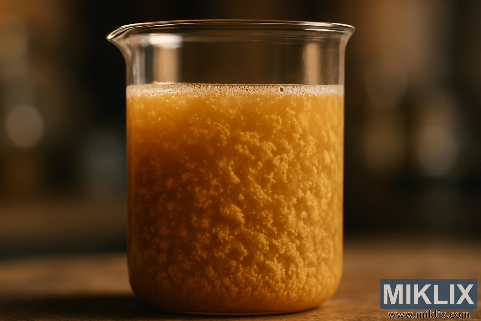 На изображении представлен детально проработанный, высококачественный крупный план прозрачного лабораторного стакана, почти до краев наполненного мутной золотисто-коричневой жидкостью. Эта жидкость полна тонкого, сложного состава: плотные, текстурированные хлопья дрожжей, взвешенные в различных слоях мути, – яркое визуальное проявление процесса флокуляции. Размер взвешенных частиц варьируется от тончайших микроскоплений, напоминающих едва подсвеченные пылинки, до плотных агрегатов, напоминающих крошечные губчатые фрагменты, лениво дрейфующие в растворе. Вместе они создают богатую текстурную картину, многослойный портрет микробиологической драмы, лежащей в основе ферментации.
