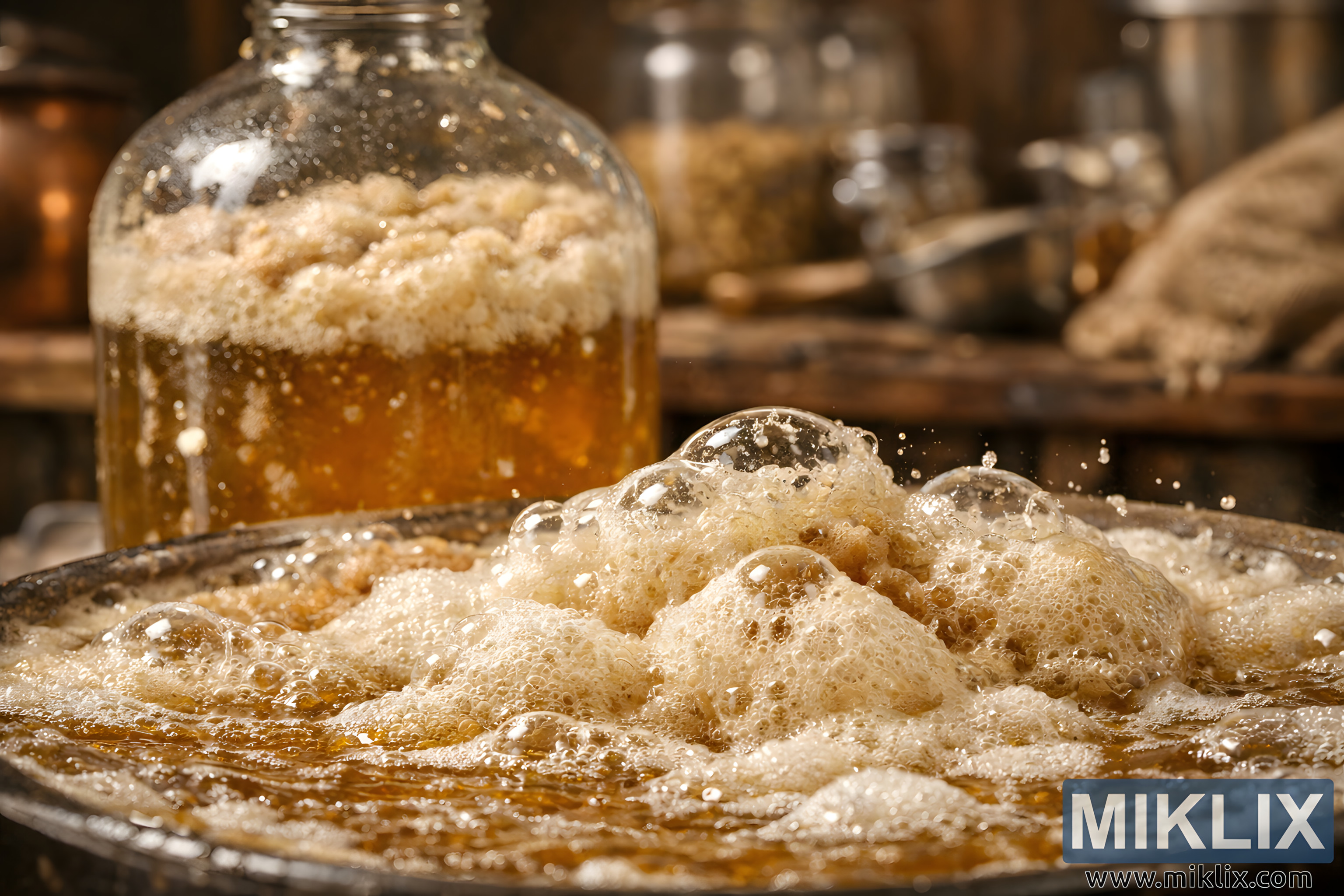 На снимке представлен детальный, крупный план процесса активного брожения эля, подчеркивающий как науку, так и мастерство пивоварения. На переднем плане доминирует поверхность жидкости золотистого цвета, наполненной движением. Крупные и мелкие пузырьки постоянно поднимаются и лопаются, образуя густую кремообразную пену, неравномерно распределяющуюся по поверхности. Пузырьки кажутся полупрозрачными и блестящими, отражая свет по мере их набухания и схлопывания, визуально передавая выделение углекислого газа дрожжами во время брожения. В жидкости взвешены мелкие частицы дрожжей, добавляющие тонкую текстуру и глубину теплым янтарным тонам эля. Мягкое и теплое освещение подчеркивает золотистый цвет и придает жидкости светящийся, почти медовый оттенок. На среднем плане в фокусе появляется прозрачный стеклянный сосуд для брожения. Стекло слегка запотело от конденсата и усеяно мелкими капельками, что указывает на тепло и активную биологическую деятельность внутри. Сквозь стекло эль выглядит плотным и насыщенным, с отчетливо выраженным дрожжевым процессом под поверхностью. Отражения вдоль изогнутых краев стекла мягко мерцают, подчеркивая ощущение ручной работы и небольшого производства. Фон размывается благодаря малой глубине резкости. Частично виден деревенский деревянный пивоваренный стол, его поверхность изношена и текстурирована, что указывает на многократное использование. На нем разбросаны нечеткие, но узнаваемые инструменты и ингредиенты для пивоварения, такие как банки, зерно и металлические приспособления, размытые таким образом, чтобы создать атмосферу, не отвлекая от главного объекта. Оттенки дерева и приглушенные формы создают уютную, ремесленную обстановку, напоминающую традиционную домашнюю пивоварню или мастерскую по крафтовому пивоварению. В целом, изображение сочетает реализм и настроение, передавая энергию брожения и воспевая тактильный, практический характер пивоварения. Сочетание бурлящего движения, теплого света, отражений в стекле и деревенской обстановки создает захватывающую картину эля в процессе трансформации.