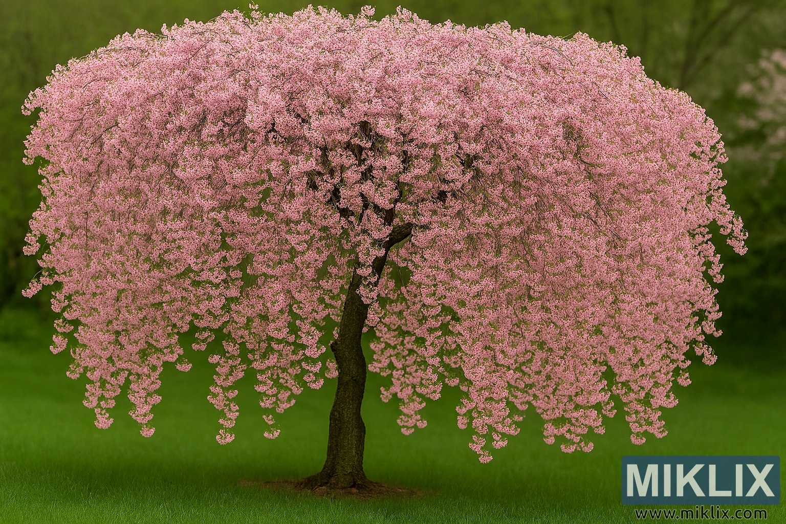 В безмятежном весеннем пейзаже плакучая вишня субхиртелла розовая распускает свои свисающие ветви, создавая захватывающую дух картину цветочного изобилия. Дерево стоит одиноко на пышной изумрудно-зелёной лужайке, его силуэт подчёркивается густым, похожим на облако пологом нежно-розовых цветов, которые каскадом ниспадают вниз изящными дугами. Каждая тонкая ветвь элегантно ниспадает к земле, образуя купол цвета и текстуры, окутывающий дерево вуалью весеннего великолепия.