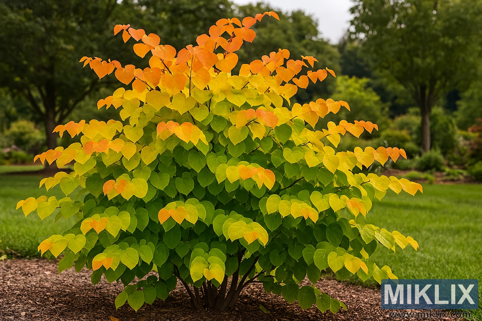 На фотографии изображен взрослый экземпляр Cercis canadensis 'Rising Sun', широко известный как Cercis canadensis 'Rising Sun', запечатленный в ландшафтном саду в период вегетации. Это декоративное дерево славится своей необыкновенной листвой, что наглядно продемонстрировано на фотографии. Крона дерева густая, с сердцевидными листьями, которые на верхушке имеют яркий золотисто-оранжевый оттенок, постепенно переходящий в яркие лимонно-жёлтые тона, а в нижней части кроны – в насыщенный средне-зелёный. Этот естественный градиент создаёт многослойную цветовую палитру, которая одновременно и уникальна с точки зрения садоводства, и визуально завораживает.