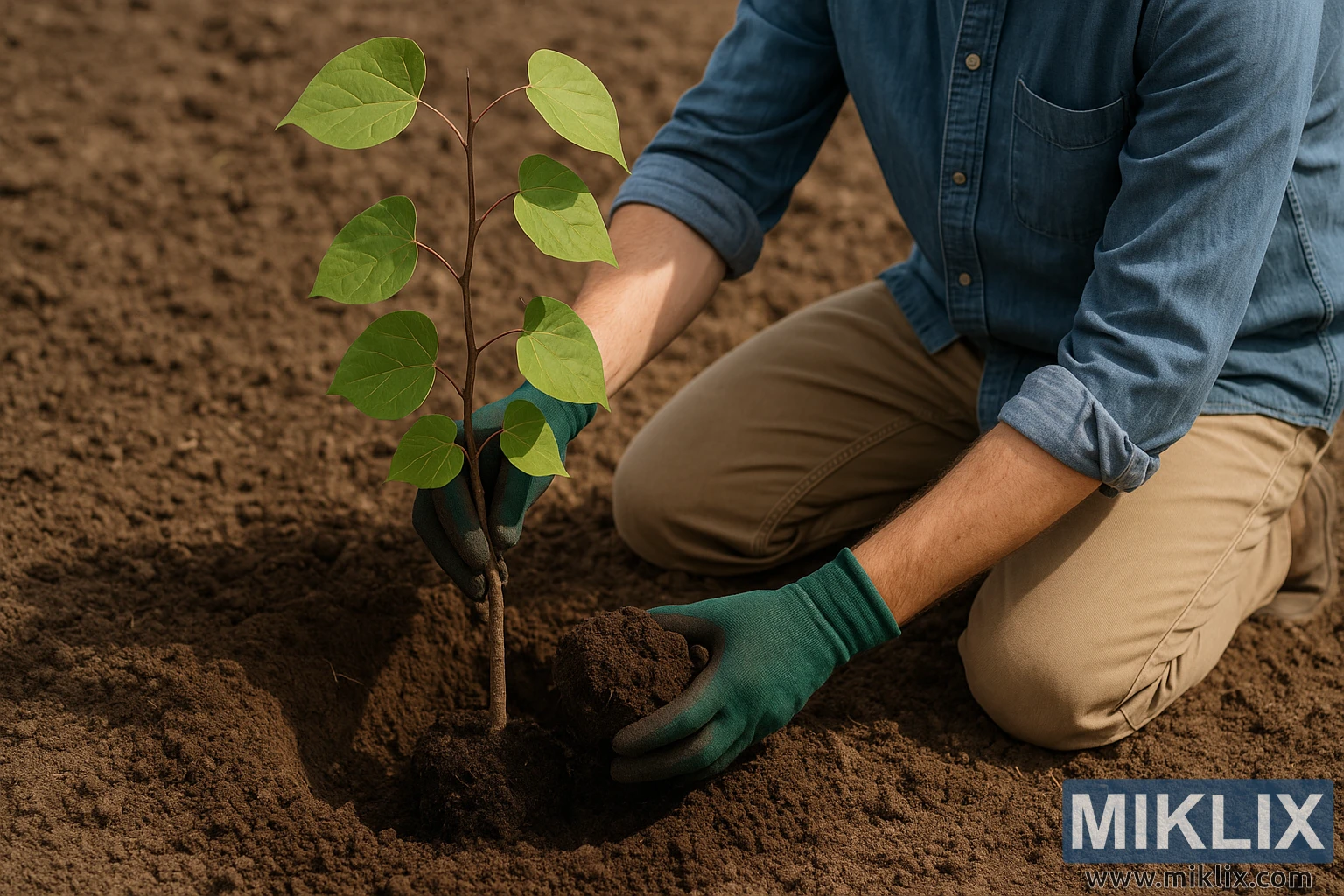 На снимке крупным планом изображен человек, сажающий молодое деревце редиба в свежеподготовленную почву. На снимке видны заботливые руки, зеленые листья и теплый естественный свет.