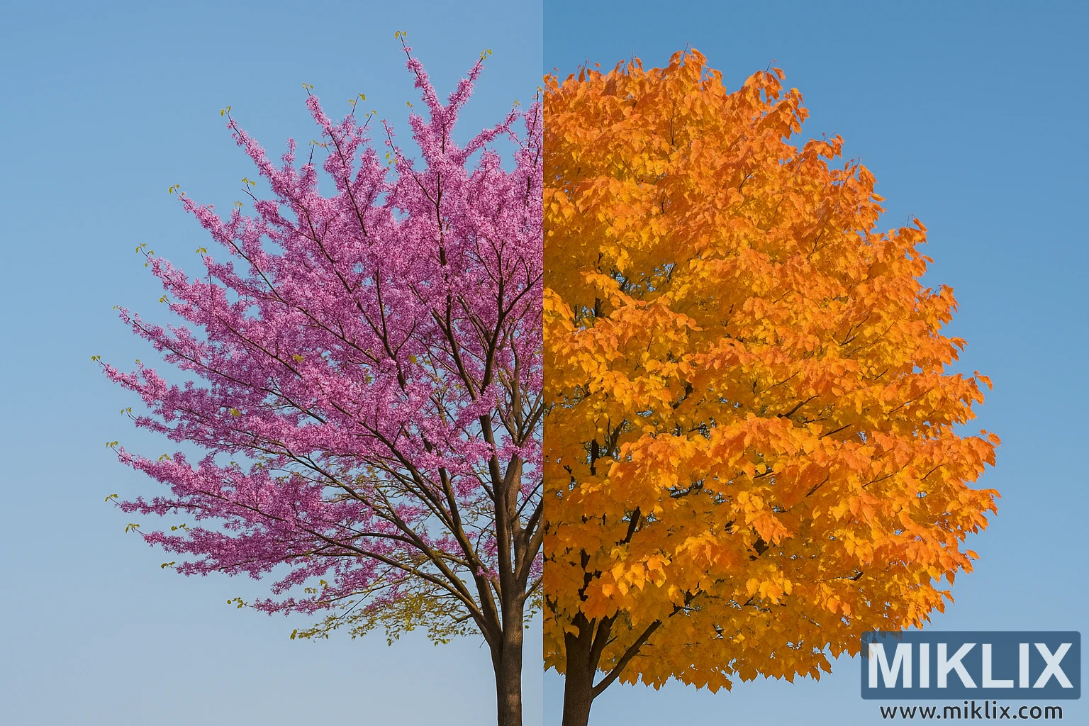 На этой пейзажной фотографии запечатлено потрясающее сезонное преображение церциса канадского (Cercis canadensis), искусно разделенного на части, чтобы передать как буйство весны, так и тепло осени. Слева дерево расцветает обилием нежных розовато-фиолетовых цветов, символизирующих раннюю весну. Цветы обрамляют ветви и даже ствол, образуя плотные соцветия, создающие мерцающий полог цвета на фоне ясного бледно-голубого неба. Ветви выглядят молодыми и стройными, их тонкие линии подчёркивают сложную сеть соцветий, а среди цветов начинают появляться маленькие, нежные зелёные листочки. Солнечный свет играет на лепестках, создавая нежную игру света и тени, которая подчёркивает текстуру и объёмность цветков.