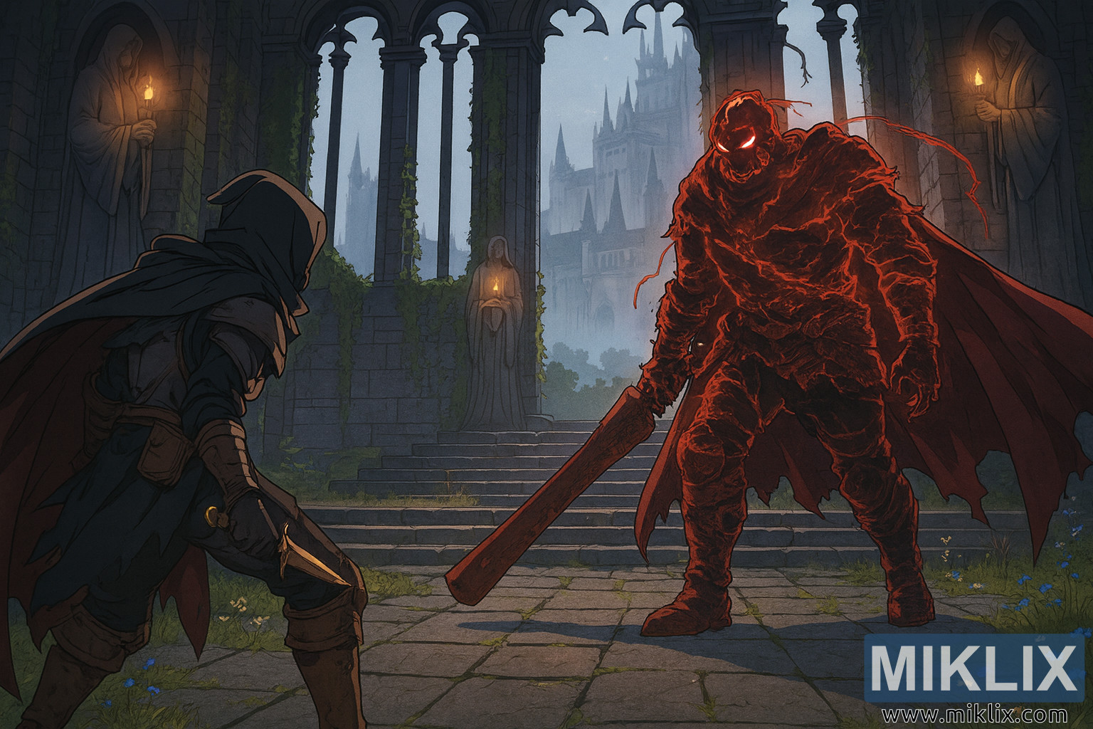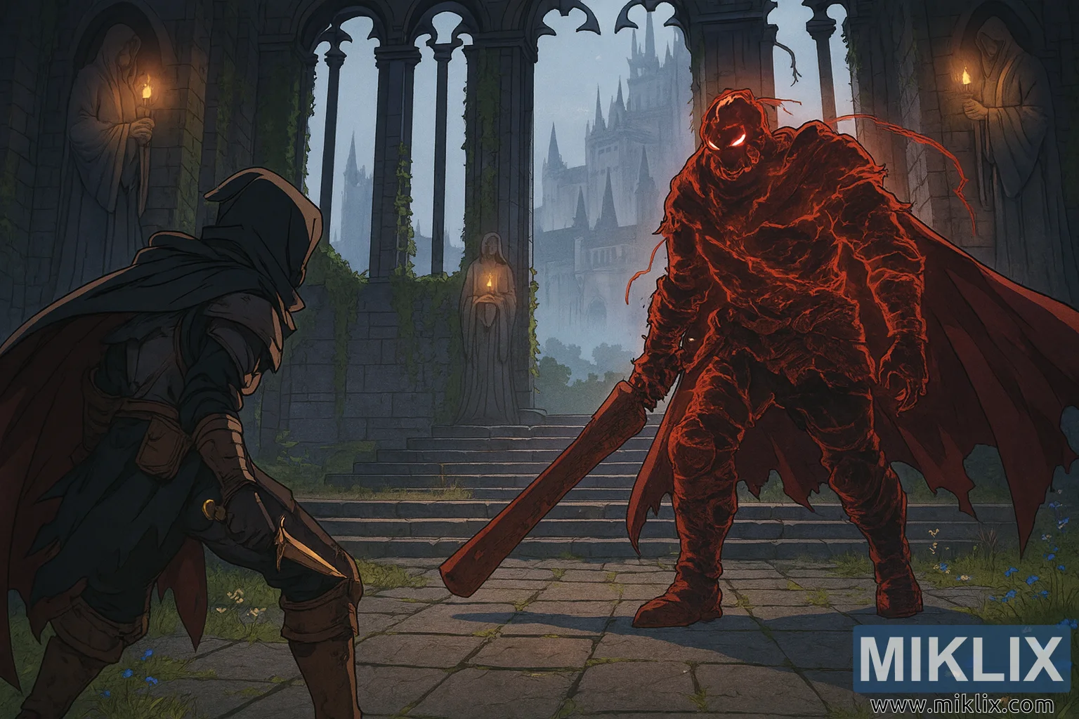 Táto fanúšikovská kresba v anime štýle zachytáva dramatickú predohru k boju medzi dvoma ikonickými postavami z Elden Ring: Tarnished odeným v brnení Čierneho noža a bossom Bell-Bearing Hunter. Obrázok, ktorý sa odohráva v strašidelne krásnom Kostole sľubov, je vykreslený vo vysokom rozlíšení na šírku, čím zdôrazňuje gotickú vznešenosť a tajomnú atmosféru miesta.