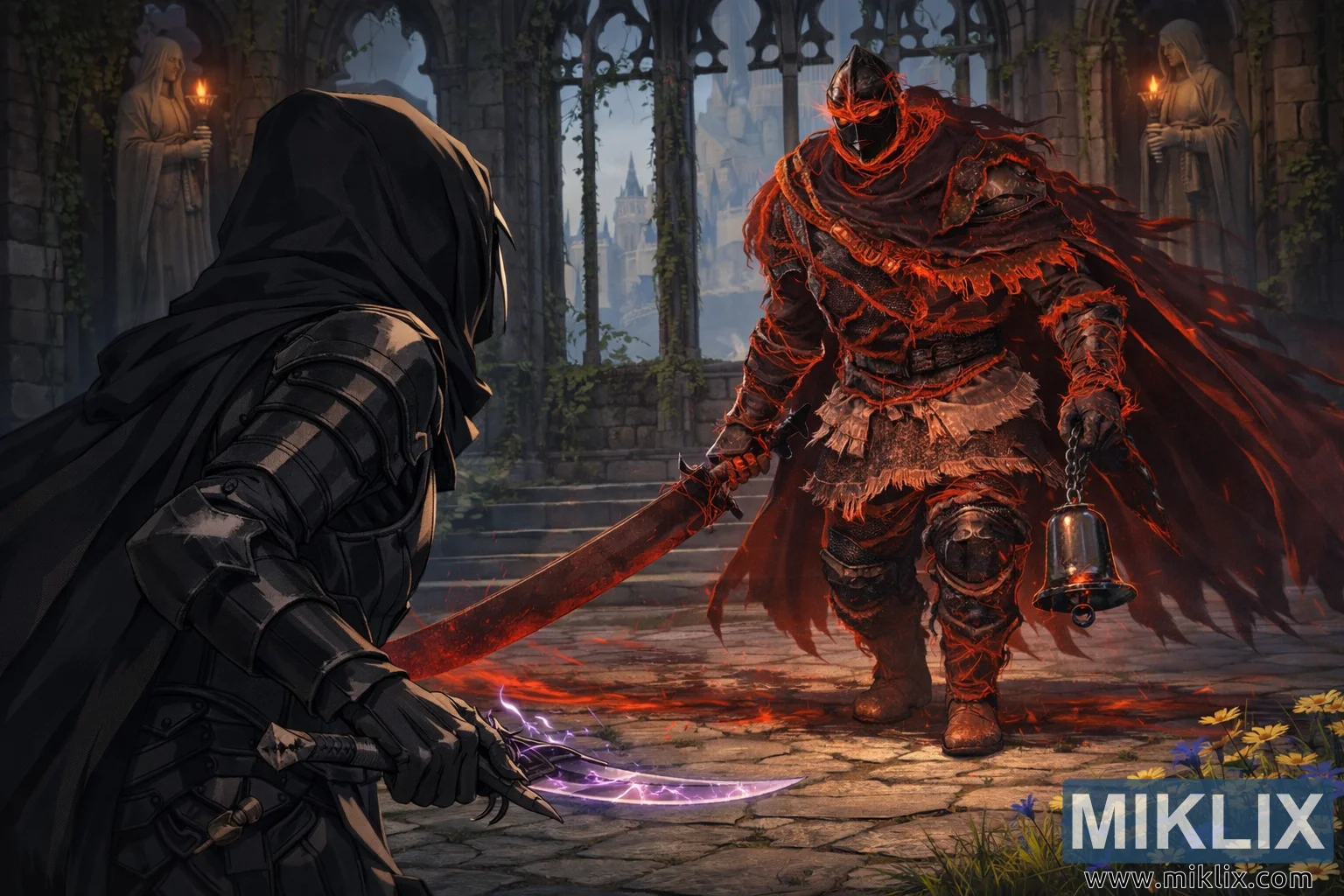 Príroda si začala znovu získavať posvätný priestor: tráva prediera cez rozbité dlaždice a pri nohách Poškvrneného kvitnú trsy žltých a modrých kvetov. Osvetlenie je starostlivo vyvážené medzi chladným pokojom ranného svetla a prudkým teplom Lovcovej aury, ktoré zalieva scénu dramatickým stretom farebných teplôt. Zatiaľ sa nič nepohlo za pomalý postup týchto dvoch protivníkov, no vzduch je ťažký nevyhnutnosťou, akoby samotný svet zadržiaval dych v poslednom údere srdca, kým sa oceľ stretne s oceľou.