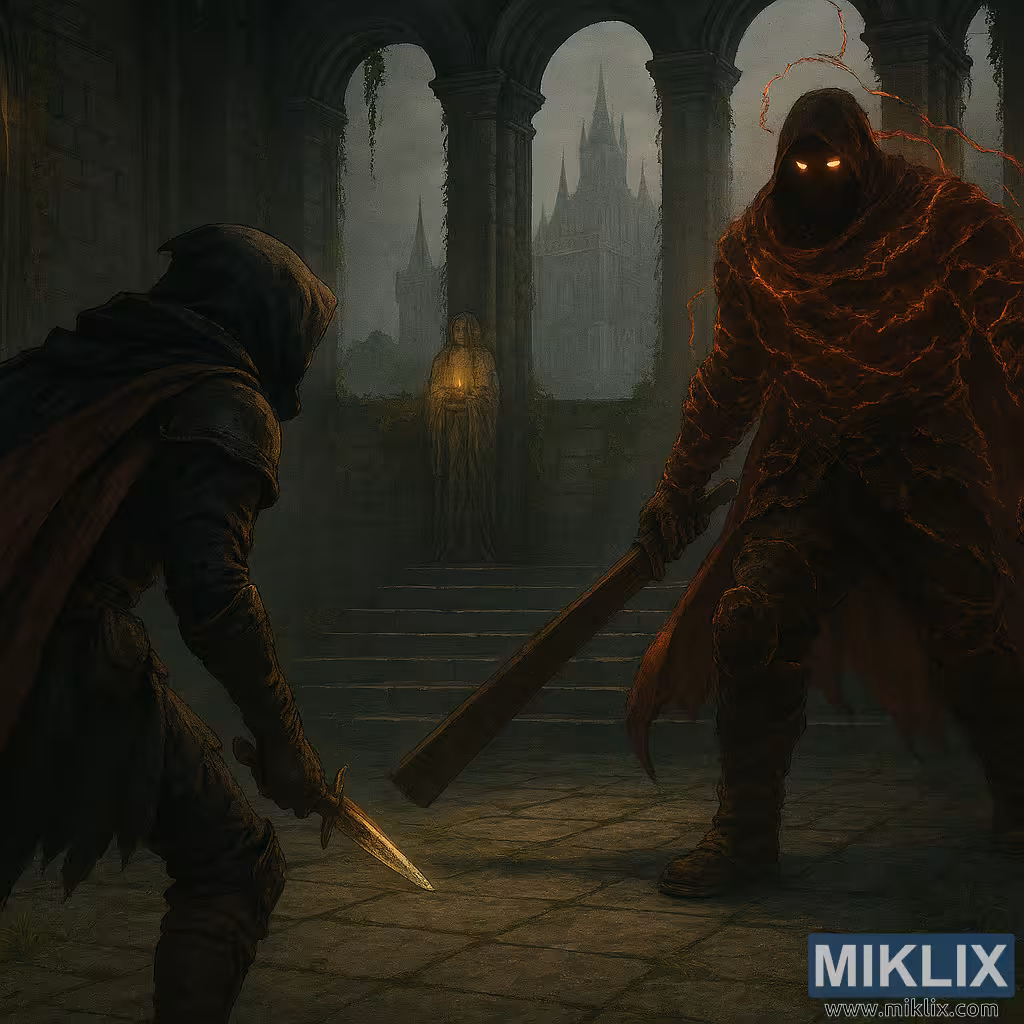 Táto polorealistická ilustrácia temnej fantasy zachytáva moment vysokého napätia medzi dvoma ikonickými postavami Elden Ring: Poškvrneným v brnení Čierneho noža a bossom Hunterom Nositeľom Zvončeka. Obrázok, zasadený do slávnostných ruín Kostola sľubov, evokuje pocit hrôzy a očakávania, vykreslený s maliarskym realizmom a atmosférickým osvetlením.