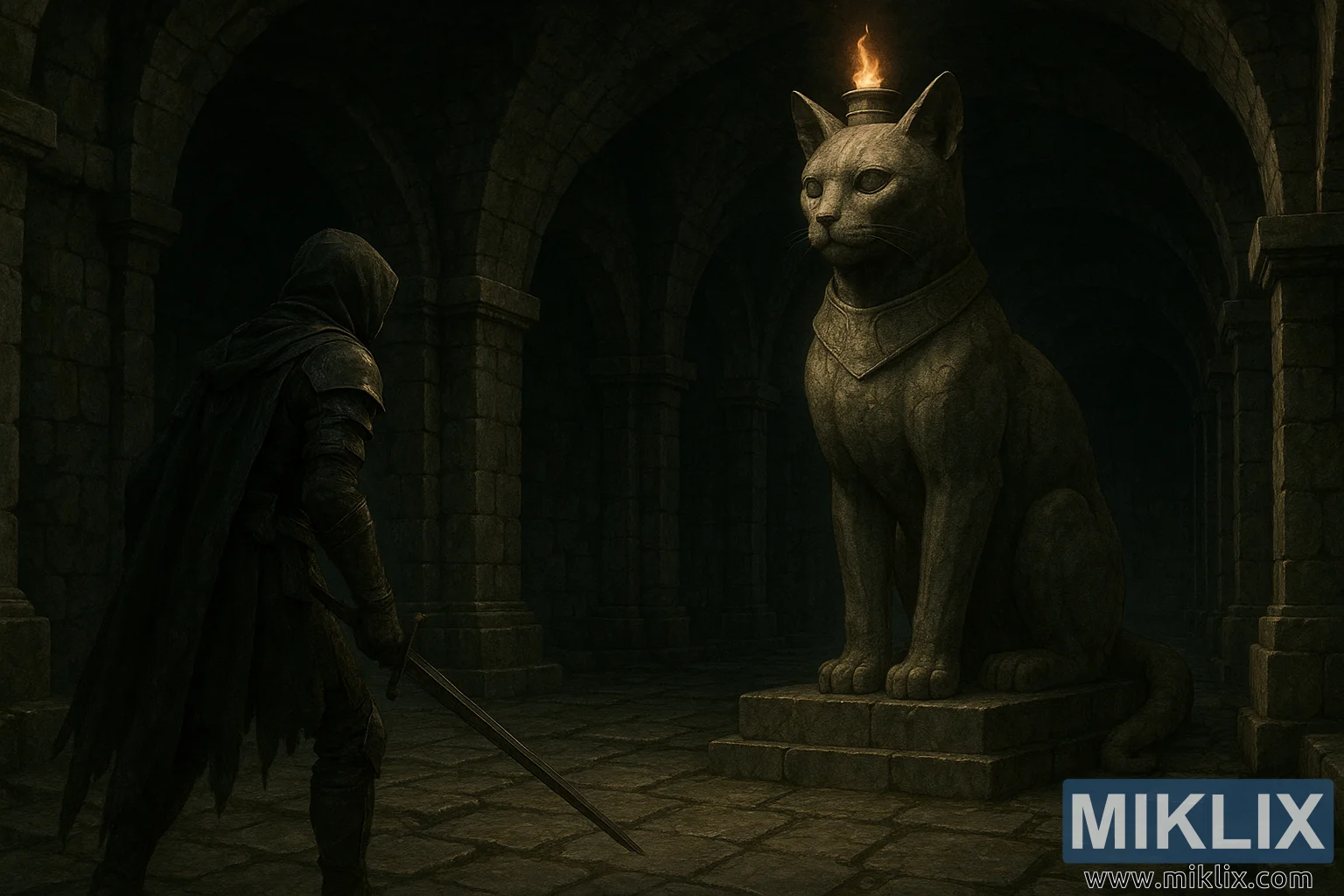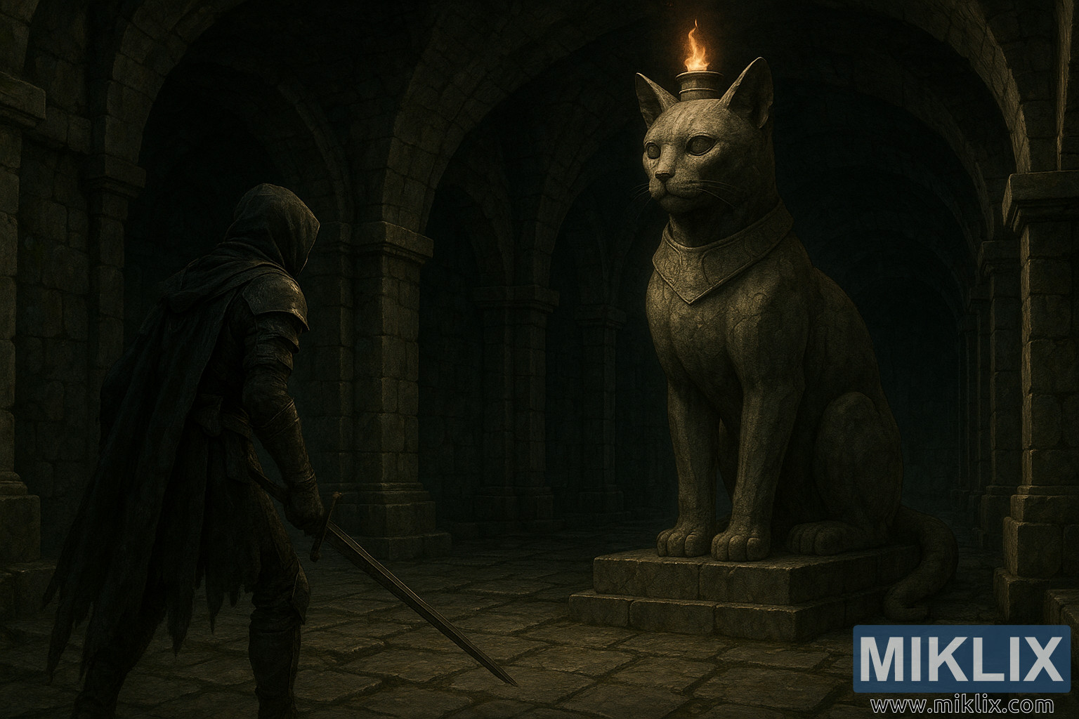 Obraz predstavuje pochmúrnu, realistickú temnú fantasy scénu zasadenú hlboko do starobylých podzemných katakomb, ktorá evokuje ťažký pocit veku, nebezpečenstva a úcty. Kompozícia je široká a filmová, zdôrazňuje rozľahlosť kamennej komory a tísnivú váhu architektúry. Hrubé kamenné stĺpy a zaoblené oblúky sa tiahnu do tmy, ich povrchy sú drsné, nerovné a zafarbené storočiami vlhkosti a rozkladu. Podlaha je dláždená veľkými kamennými dlaždicami, miestami opotrebovanými do hladka a inde popraskanými, ktoré jemne odrážajú slabé svetlo, ktoré sotva preniká cez šero.