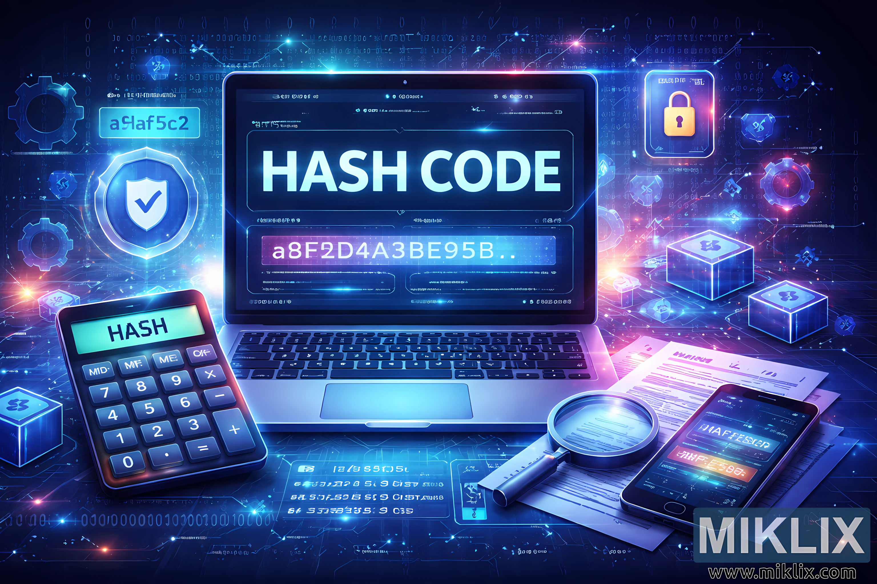 Obrázok predstavuje širokouhlu ilustráciu na šírku s pomerom strán 16:9 s modernou, high-tech estetikou navrhnutou pre blogovú kategóriu zameranú na kalkulačky hash kódu. V strede kompozície je otvorený notebook pohľadom spredu, ktorého obrazovka svieti tmavomodrou a azúrovou farbou. Na obrazovke je výrazne zobrazený text „HASH CODE“ tučným, čistým písmom, pod ktorým sa nachádza dlhý alfanumerický reťazec, ktorý vizuálne predstavuje vygenerovanú hash hodnotu. Klávesnica a trackpad notebooku sú vykreslené s jemnými odleskami, ktoré zdôrazňujú elegantné a profesionálne počítačové prostredie.