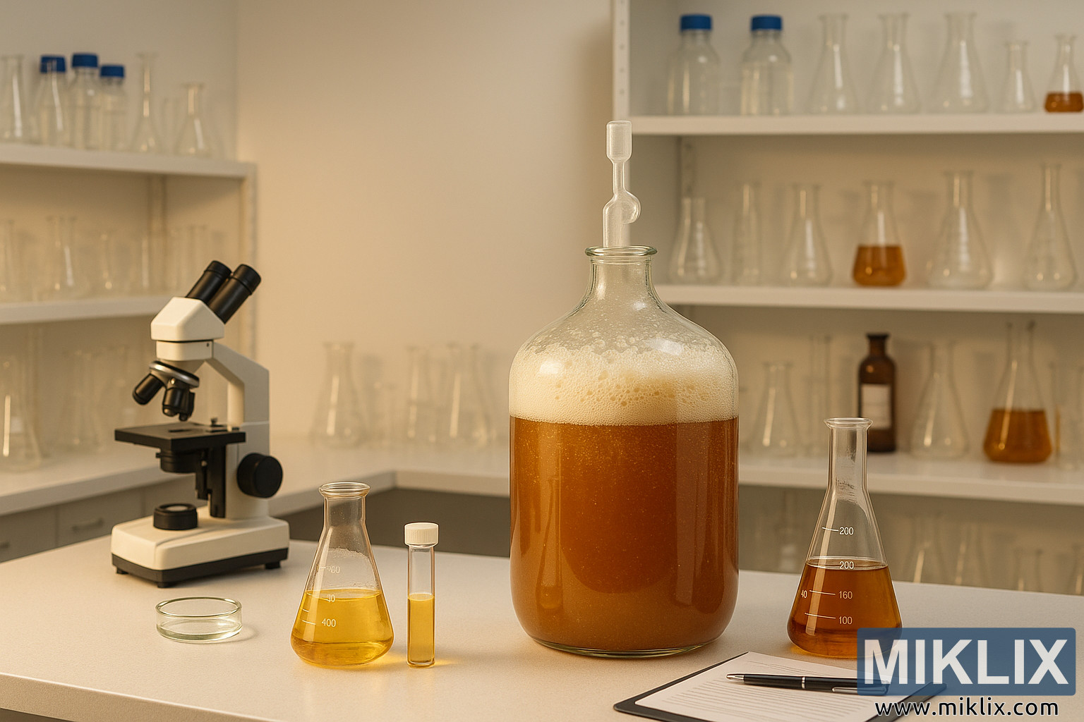 Obrázok zobrazuje moderné pivovarnícke laboratórium, starostlivo usporiadané tak, aby zdôrazňovalo vedu aj umenie, ktoré stoja za fermentáciou. V strede kompozície sa nachádza veľká, priehľadná sklenená demižóna naplnená kvasiacou mladinou. Kvapalina vo vnútri žiari tmavo zlatým jantárovým odtieňom, korunovaná hrubou vrstvou penových bublín, ktoré naznačujú aktívny metabolizmus kvasiniek. Drobné suspendované častice v kvapaline zachytávajú teplé svetlo a zdôrazňujú dynamickú povahu fermentačného procesu. Na vrchu demižónu je bezpečne umiestnená štíhla sklenená vzduchová komora, jednoduchý, ale dôležitý nástroj, ktorý umožňuje únik oxidu uhličitého a zároveň chráni vzácny obsah pred vonkajšími kontaminantmi.