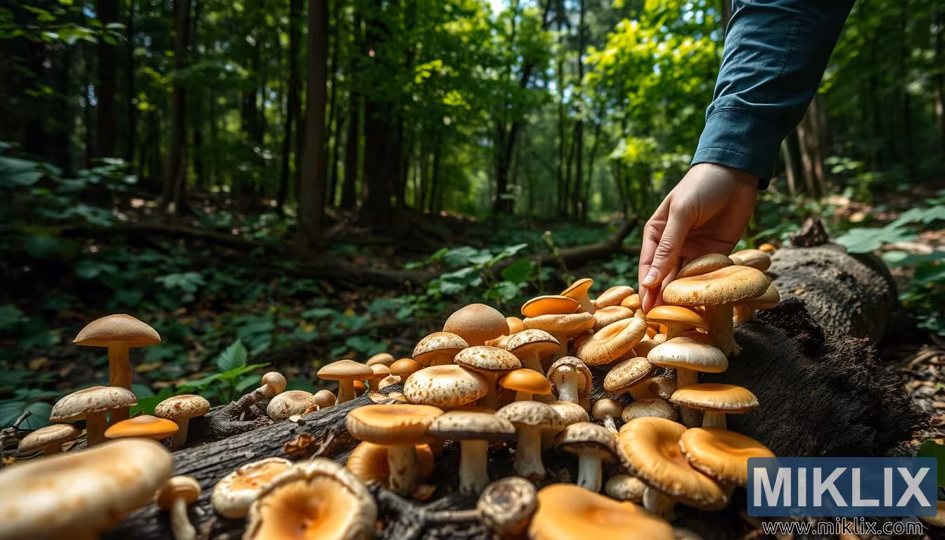 Osoba starostlivo vyberá huby ako shiitake, ustricové a crimini v bujnom slnečnom lese, pričom zdôrazňuje prirodzené textúry a vďačnosť za prírodu.