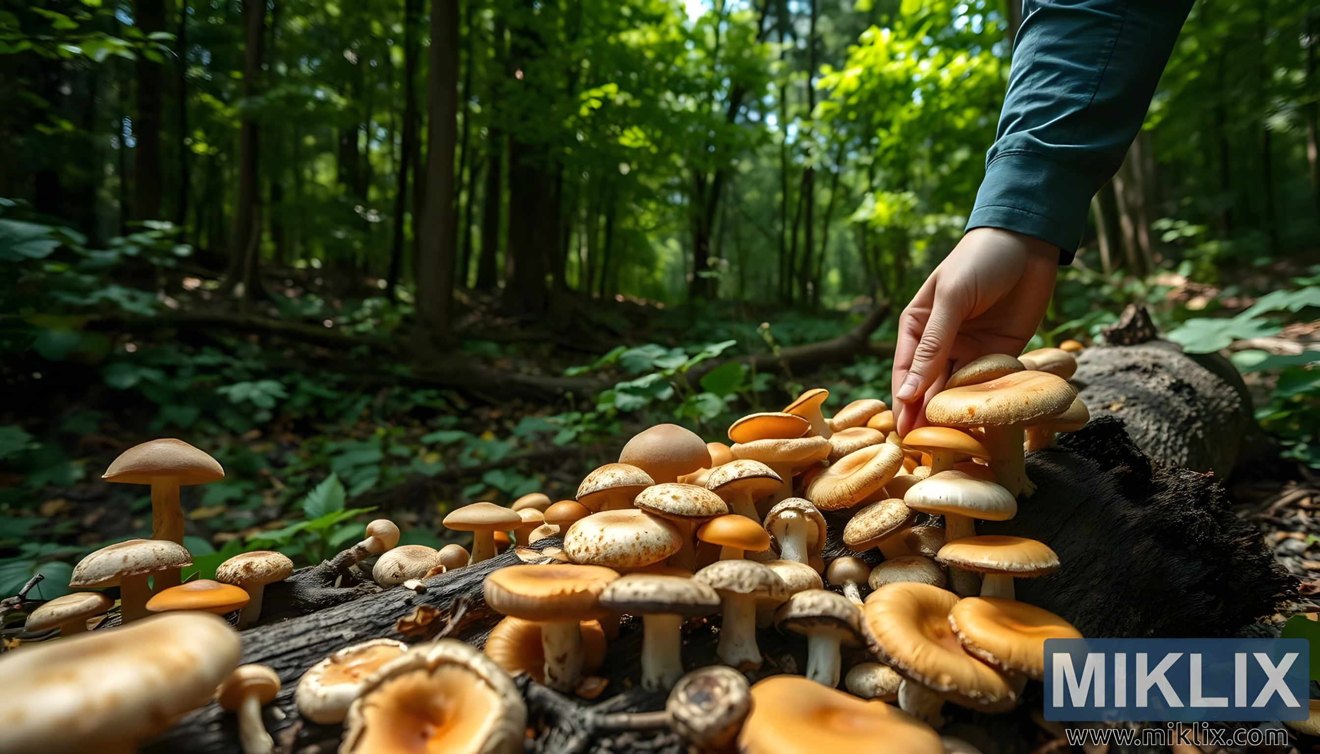 tejto pútavej lesnej scenérii je divák okamžite vtiahnutý do pokojného okamihu, kde sa pretína príroda a ľudská zvedavosť. Obrázok zobrazuje bujný les zaliaty jemným svetlom popoludňajšieho slnka, ktorého lúče jemne prenikajú cez hustú klenbu žiarivo zelených listov. Uprostred pokoja týčiacich sa stromov a bohatého podrastu sa spadnutý kmeň stal dokonalým hostiteľom pre prosperujúcu kolóniu lesných húb. Ich klobúky, v odtieňoch od svetlokrémovej až po sýtu jantárovú a tmavo zlatohnedú, vytvárajú výraznú vizuálnu mozaiku, ktorá krásne kontrastuje s tmavým, rozkladajúcim sa drevom pod nimi. Niektoré huby majú hladké, nepoškvrnené klobúky, ktoré sa vo filtrovanom svetle slabo lesknú, zatiaľ čo iné majú škvrnité vzory a textúry, ktoré naznačujú ich rôzne štádiá rastu a zrelosti. Lesná pôda okolo kmeňa je posiata širokými listami, vetvičkami a malými škvrnami machu, čo umocňuje vrstevnatý pocit organickej bohatosti, ktorá definuje toto prostredie.