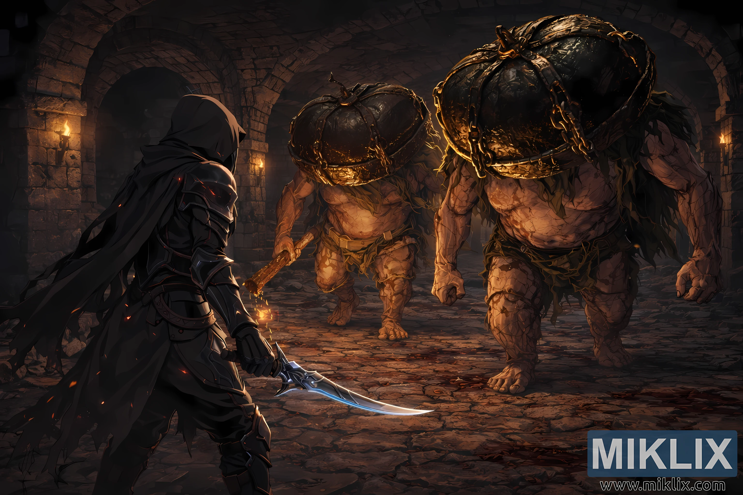 Visokoločljivostna anime pokrajinska umetnost oboževalcev, na kateri se Črni nož Tarnished sooča z dvema masivnima šefoma Mad Pumpkin Head v kleti z baklami pod ruševinami Caelem v Elden Ringu.