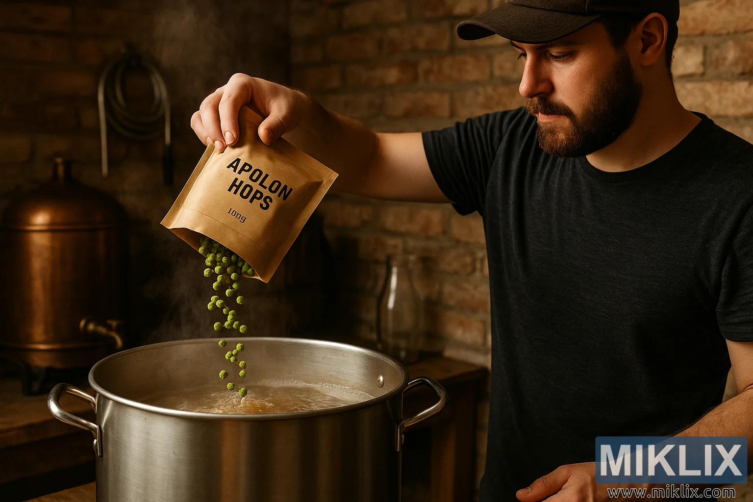 roki drži rjavo kraft papirnato vrečko z oznako »APOLON HOPS 100g« z odebeljenimi črnimi črkami. Iz vrečke se sredi gibanja ujame kaskada živahnih zelenih hmeljskih peletov, ki lebdijo v zraku tik preden zadenejo vročo tekočino spodaj. Hmelj je videti živopisen v primerjavi s temnejšimi toni prostora in pritegne pogled na to ključno dejanje. Iz kotlička se dvigajo prameni pare, ki se zvijajo navzgor in se mešajo z slabo osvetljenim ozadjem, kar nakazuje tako vročino procesa kot čutno vzdušje – skoraj si lahko predstavljamo aromo vrelega slada in svežega hmelja, ki napolnjuje zrak.