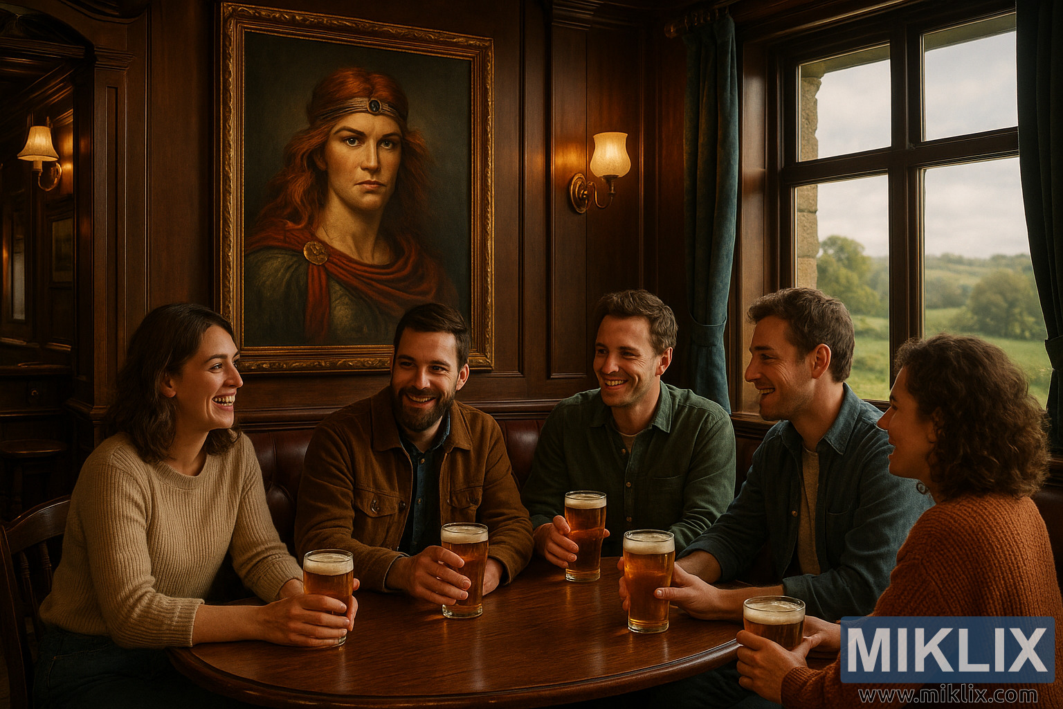 Topla in vabljiva pubska scena, kjer prijatelji uživajo ob pivih pod veličastnim portretom Boadicee, ki združuje skupnost, zgodovino in podeželski čar.