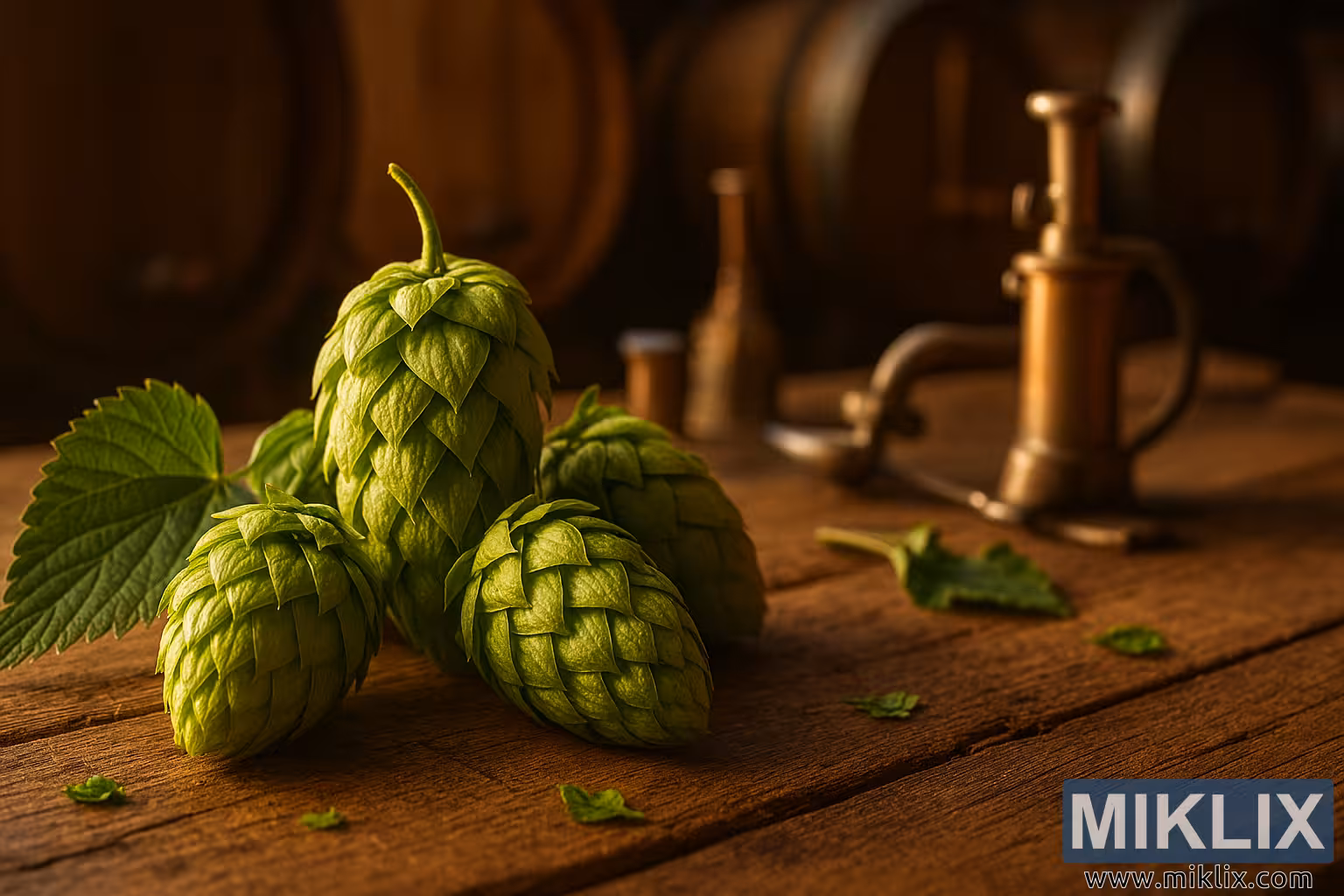V mehko zamegljenem ozadju se vrsta hrastovih sodov s kovinskimi trakovi nežno ukrivlja v daljavo. Njihovi topli, medeni toni in zaobljene oblike ustvarjajo občutek globine in tradicije ter obujajo spomin na faze staranja in fermentacije piva. Sodi so obsijani z zlato uro svetlobe, ki se filtrira skozi nevidno okno in meče nežne, usmerjene sence po mizi ter osvetljuje hmeljne storže s toplim sijajem.