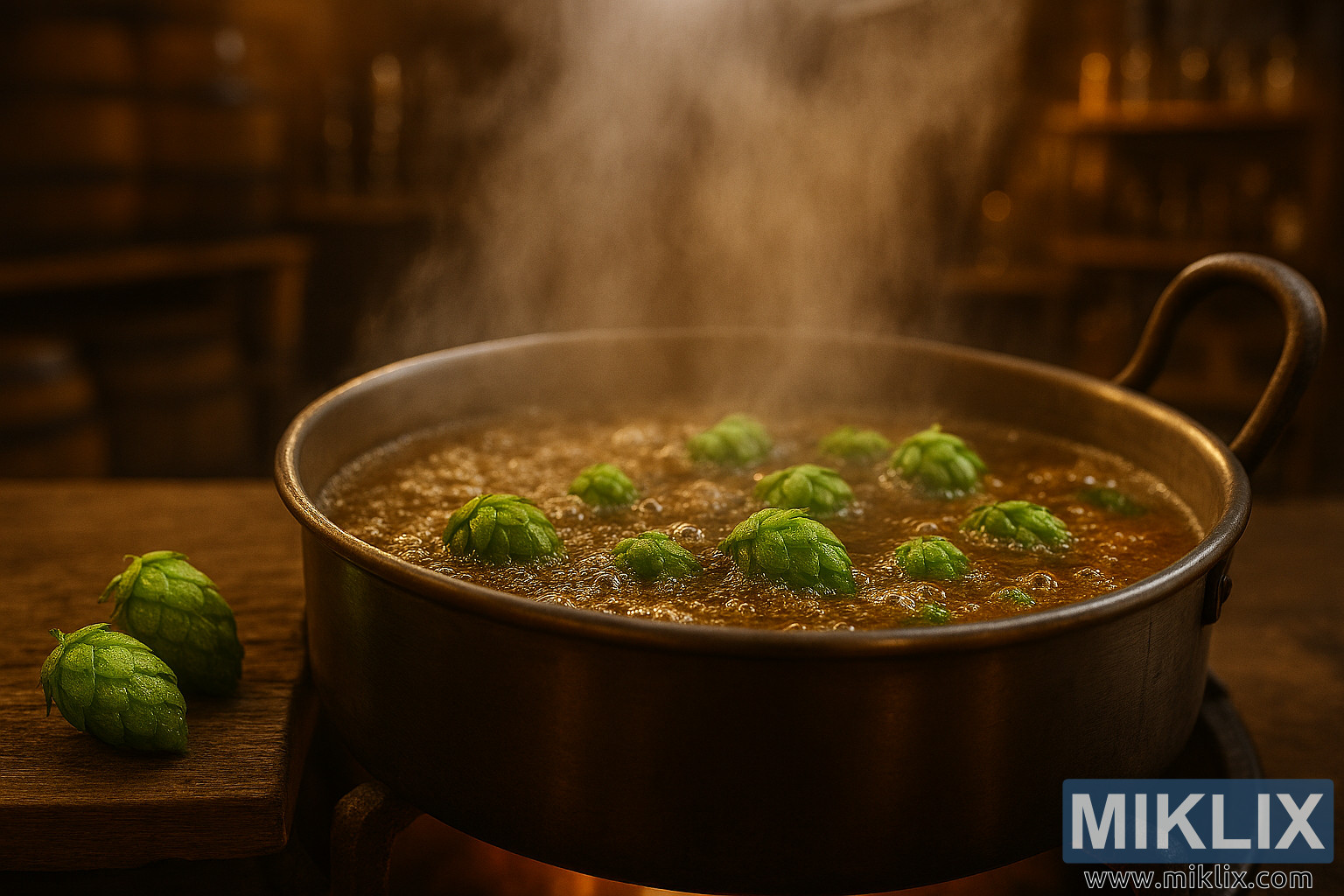 Na sredini prevladuje velik kotel iz nerjavečega jekla, napolnjen z močno vrelo jantarno pivino. Površina tekočine je živa od gibanja – penasti mehurčki in vrtinčasta pena obdajajo več plavajočih hmeljskih storžev, ki so delno potopljeni in sproščajo svoja aromatična olja v pivino. Para se dviga v gostih, kodrastih oblakih, ki delno zakrivajo ozadje in dodajajo taktilni občutek toplote in aktivnosti. Kotliček stoji na odprtem ognju, ki na spodnji strani meče topel oranžen sij in prispeva k zlatemu vzdušju prizora.