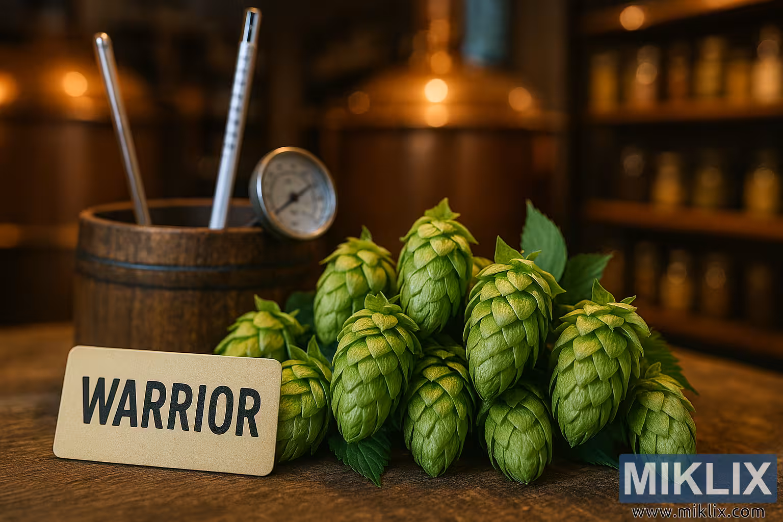 Med hmeljem je majhen pravokoten napis "WARRIOR" z velikimi črnimi črkami na krem ozadju, ki poudarja sortno identiteto. Tik za to osrednjo točko stoji čudovito staran lesen sod, ki služi kot posoda za bistvena orodja za varjenje piva. Topli rjavi toni in vidna lesena tekstura soda vzbujajo občutek rustikalne izdelave. V notranjosti se na rob nežno naslanja tanek steklen hidrometer, njegova umerjena skala pa je vidna skozi prozorno cev. Zraven kuka okrogel termometer za varjenje piva z belo številčnico in črnimi oznakami, njegova igla pa je pripravljena za natančno merjenje. Ta orodja subtilno poudarjajo tehnično skrbnost, ki je vključena v proces varjenja piva.