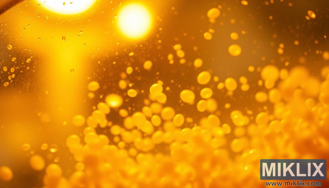 Zamegljeno ozadje ustvarja občutek globine, ki gledalčev pogled trdno pritegne k kvasovkam v ospredju. Namiguje na prisotnost laboratorijske opreme – steklenih posod, merilnih valjev ali bučk – vendar jih pušča nejasne, namesto tega poudarja tiho dramo, ki se odvija v tekočem mediju. V fokusiranem območju se med kvasovkami dvigajo mehurčki različnih velikosti, kar nakazuje ne le na stazo, temveč na nenehen, živ proces. Prepletanje zaobljenih kvasnih zrn in šumečih mehurčkov vnaša občutek dinamike, kot da bi bil sam čas zamrznjen na vrhuncu fermentacijske aktivnosti. V kompoziciji prevladujejo topli toni, jantarni in zlati poudarki pa se spuščajo po suspendiranih delcih in ustvarjajo vizualno povezavo s pivom, ki bo na koncu proizvedeno.