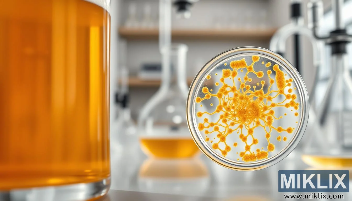 Sodoben laboratorijski prizor s čašo zlatega piva, vzorcem kvasa v petrijevki in znanstvenimi orodji, ki poudarjajo senzorično analizo kvasovk.