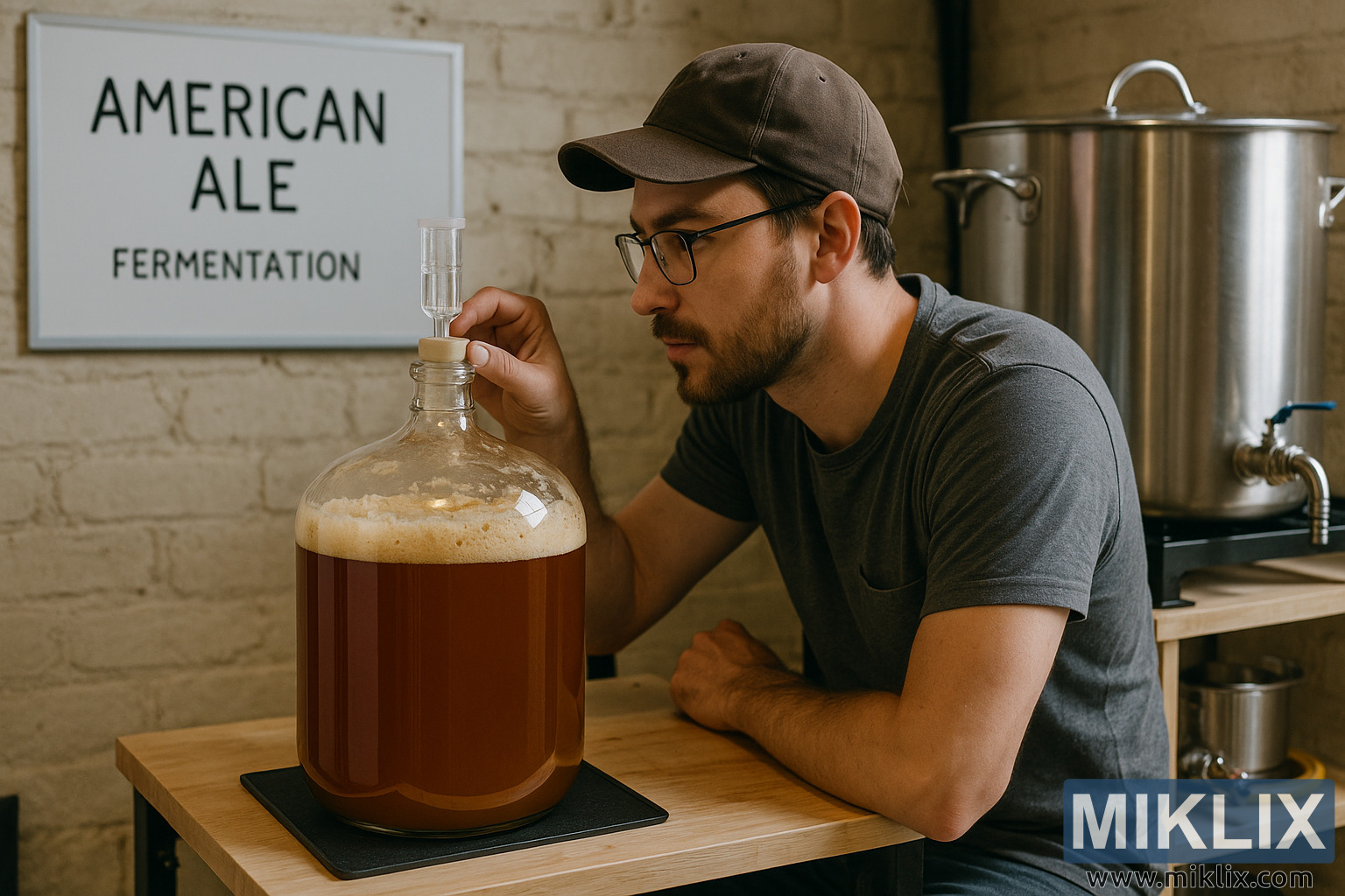 Slika prikazuje osredotočenega domačega pivovarja, ki skrbno spremlja proces fermentacije ameriškega piva v prijetnem in dobro organiziranem domačem pivovarskem okolju. Sedi za trdno leseno mizo, rahlo nagnjen naprej, s pozorno pozornostjo, usmerjeno v velik steklen balon, napolnjen z jantarno obarvano pivino v aktivni fermentaciji. Na vrhu tekočine leži gosta, penasta tekočina (krausen), kar kaže na živahno fazo delovanja kvasovk. Domači pivovar z eno roko drži vrat balona, medtem ko pregleduje zračno zaporo – majhno, prozorno plastično napravo, ki je nameščena na gumijastem zamašku in nežno brbota, ko uhaja CO₂, kar signalizira pravilno fermentacijo.
