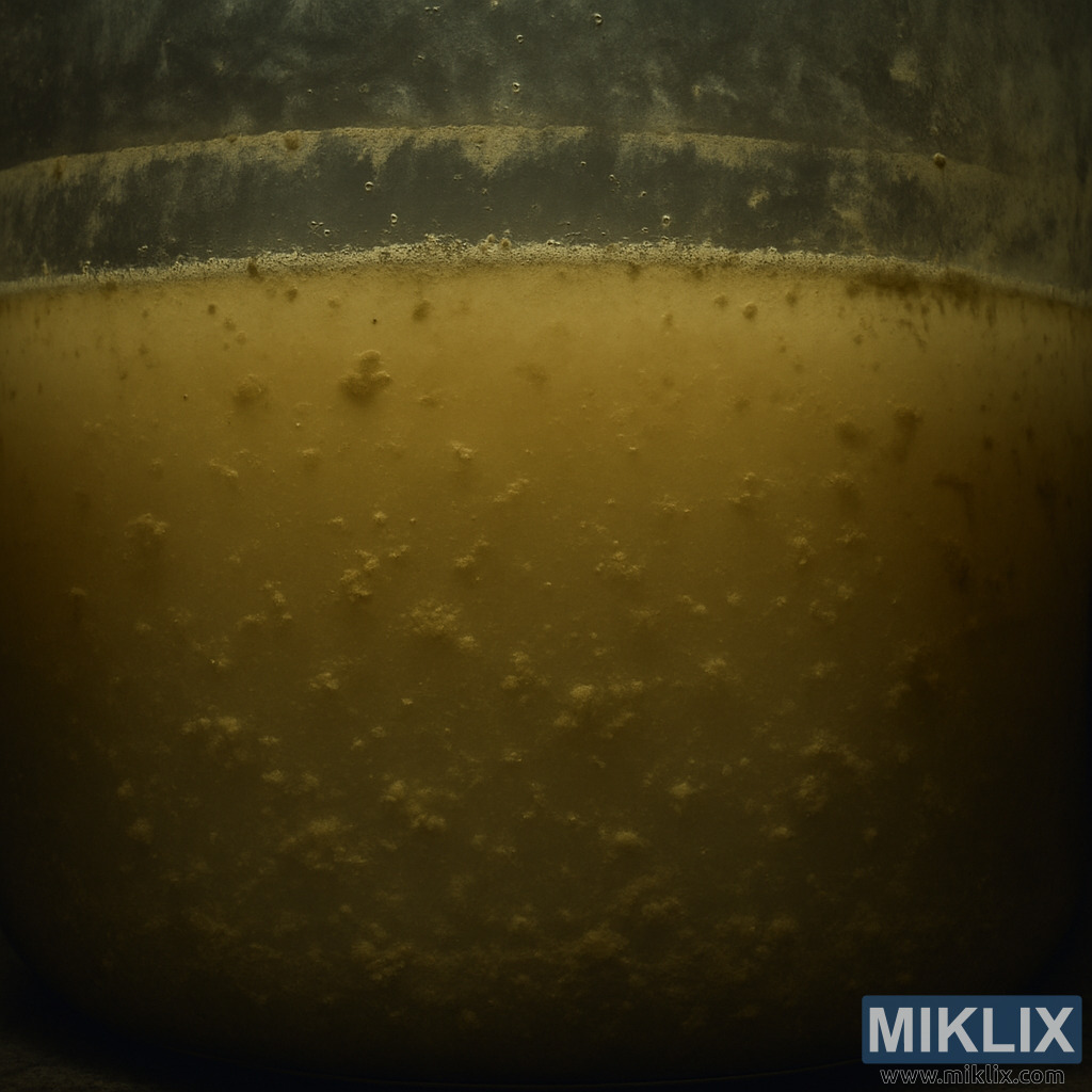 Slika prikazuje bližnji posnetek velike valjaste fermentacijske posode, napolnjene z neprivlačno, motno tekočino, ki takoj vzbuja občutek ustavljene aktivnosti. Tekočina ima motno, oker rjavo barvo in je videti gosta, skoraj podobna kaši, z neenakomerno porazdeljenimi suspendiranimi delci različnih velikosti. Ti delci ustvarjajo lisasto teksturo, ki se oprijemajo v mehke skupke, medtem ko drugi prosto lebdijo in dajejo vtis usedline, ki se ni niti dvignila niti usedla. Splošna konsistenca kaže na počasno ali zaustavljeno biokemijsko aktivnost, značilno za fermentacijski proces, ki je prenehal napredovati ali je šel narobe.