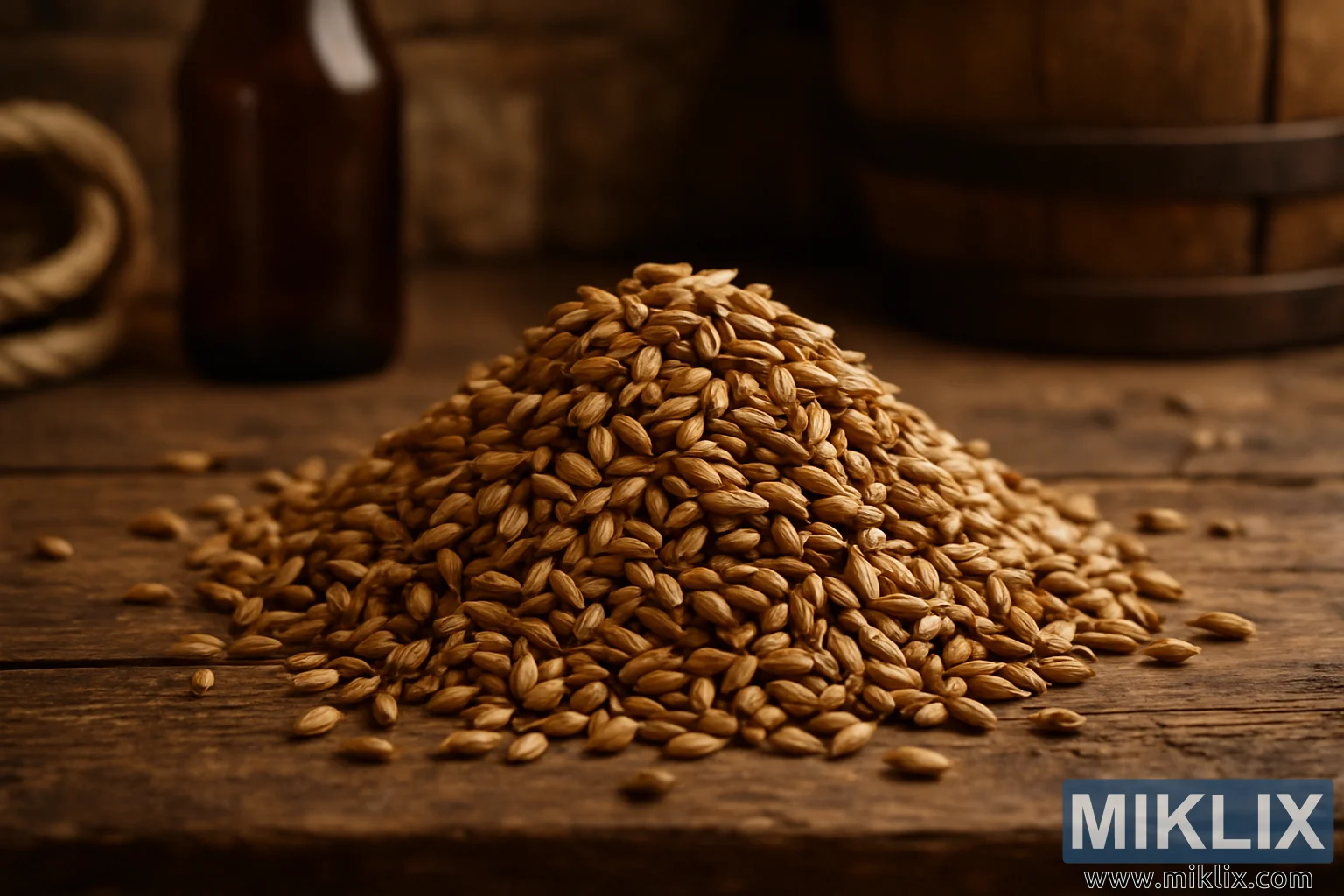 Slika prikazuje bližnji, krajinsko usmerjen pogled na majhen kupček pšeničnega slada, ki počiva na rustikalni leseni mizi v okolju, ki je navdihnjeno z domačim pivovarstvom. V središču kompozicije je kupček sladnih pšeničnih zrn, rahlo zloženih tako, da se posamezna zrna raztresejo navzven in naravno razpršijo po mizi. Vsako zrno je podolgovato in rahlo ukrivljeno, z nedotaknjenimi lupinami, kar kaže na toplo paleto zlatih, medenih in svetlo rjavih tonov. Površinska tekstura slada je jasno vidna in razkriva subtilne grebene, gube in barvne razlike, ki kažejo na skrbno sladenje in sušenje.