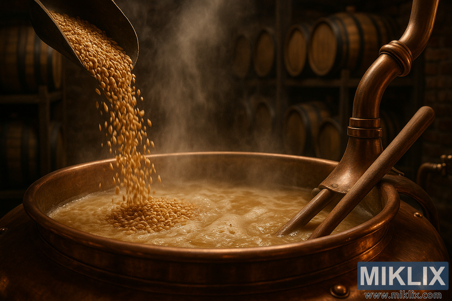 V prijetni pivovarni se zlati pšenični slad vlije v bakren kotel, medtem ko se dviga para in mešajo drozge, hrastovi sodi v ozadju pa vzbujajo spomin na obrt.