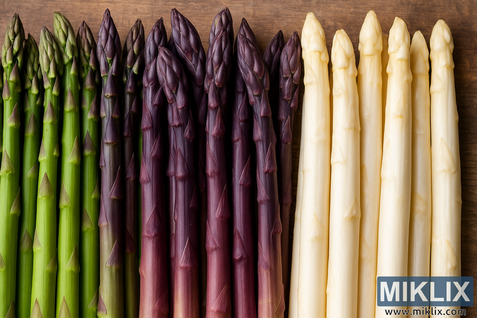 Fotografija visoke ločljivosti, ki prikazuje zelene, vijolične in bele špargljeve stebla, lepo razporejene na rustikalni leseni površini.