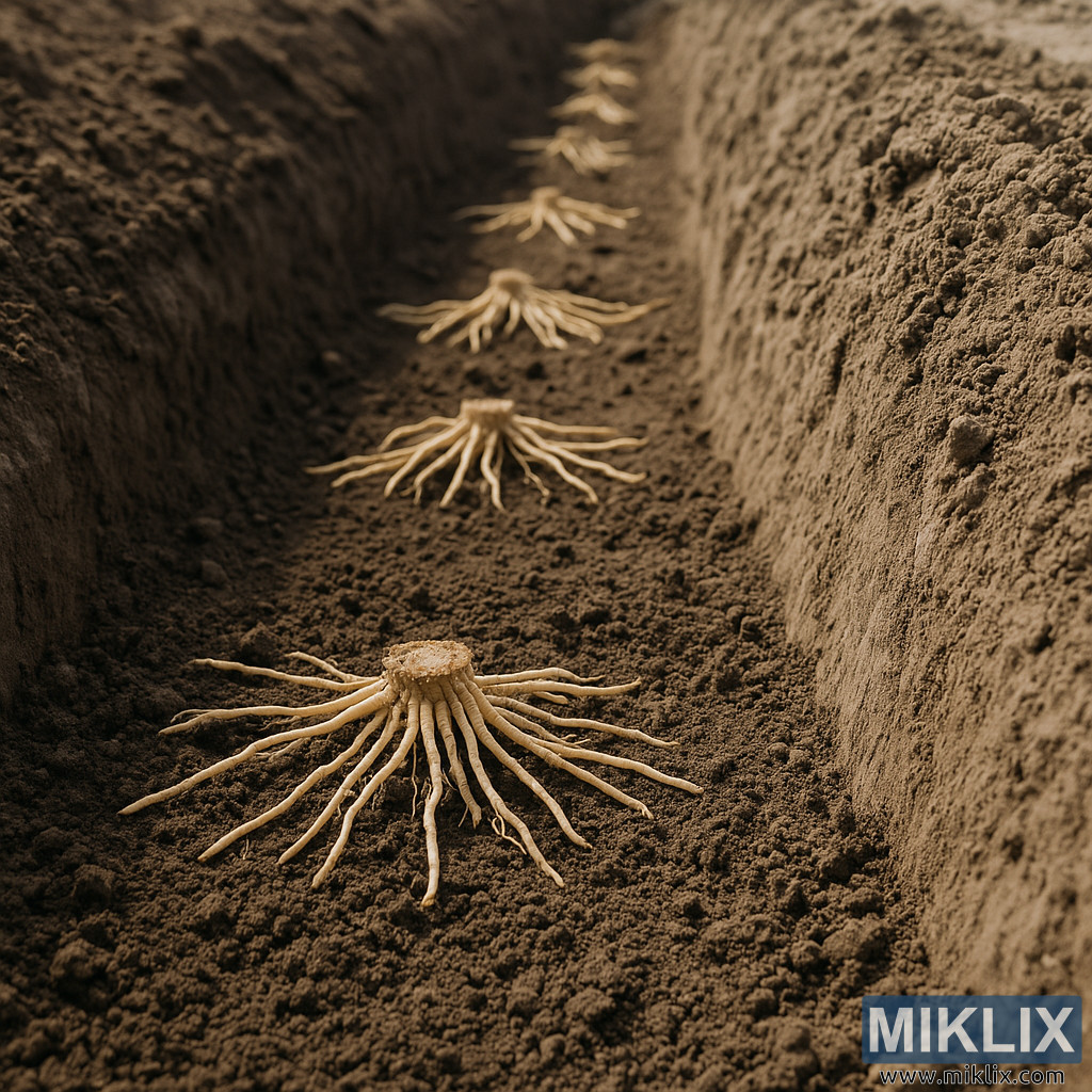 Podroben pogled na krone belušev, pravilno razporejene v sadilnem jarku, ki prikazuje pravilno postavitev korenin in strukturo tal za uspešno rast.