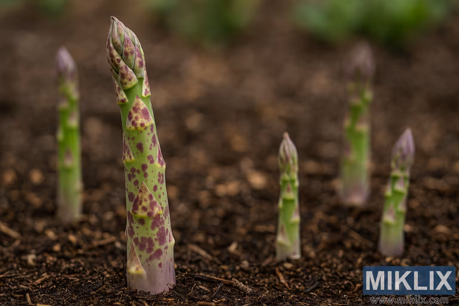 Podrobna fotografija od blizu špargljev, ki rastejo iz gredice in imajo na steblih značilne vijolične pike.