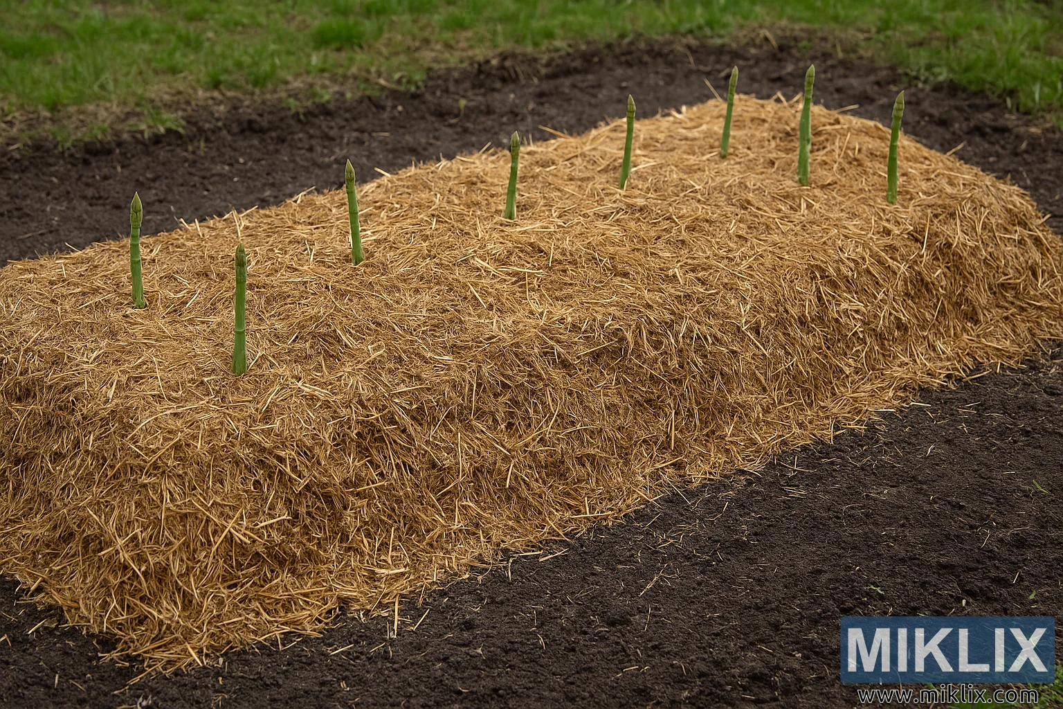 Ta slika prikazuje skrbno pripravljeno gredico belušev, zasnovano za zimsko zaščito. Gredica je rahlo dvignjena nad okoliško zemljo in je obilno prekrita z debelo plastjo zlato rjave slamnate zastirke. Slama je rahle teksture, posamezni kosi pa se križajo v naravnem vzorcu, kar kaže na to, da je bila pred kratkim nanesena in enakomerno porazdeljena. Zastirka tvori mehko, izolacijsko kupo, ki pomaga zaščititi krone trajnic belušev pred nizkimi temperaturami, zmrzaljo in sušenjem zimskih vetrov. Kljub letnemu času je skozi plast zastirke vidnih več zdravih zelenih poganjkov belušev. Ti poganjki so visoki, ravni in enakomerno razporejeni, s tesno zaprtimi konicami, ki imajo rahlo vijoličen odtenek – značilnost, ki jo pogosto najdemo pri svežih, živahnih poganjkih belušev.