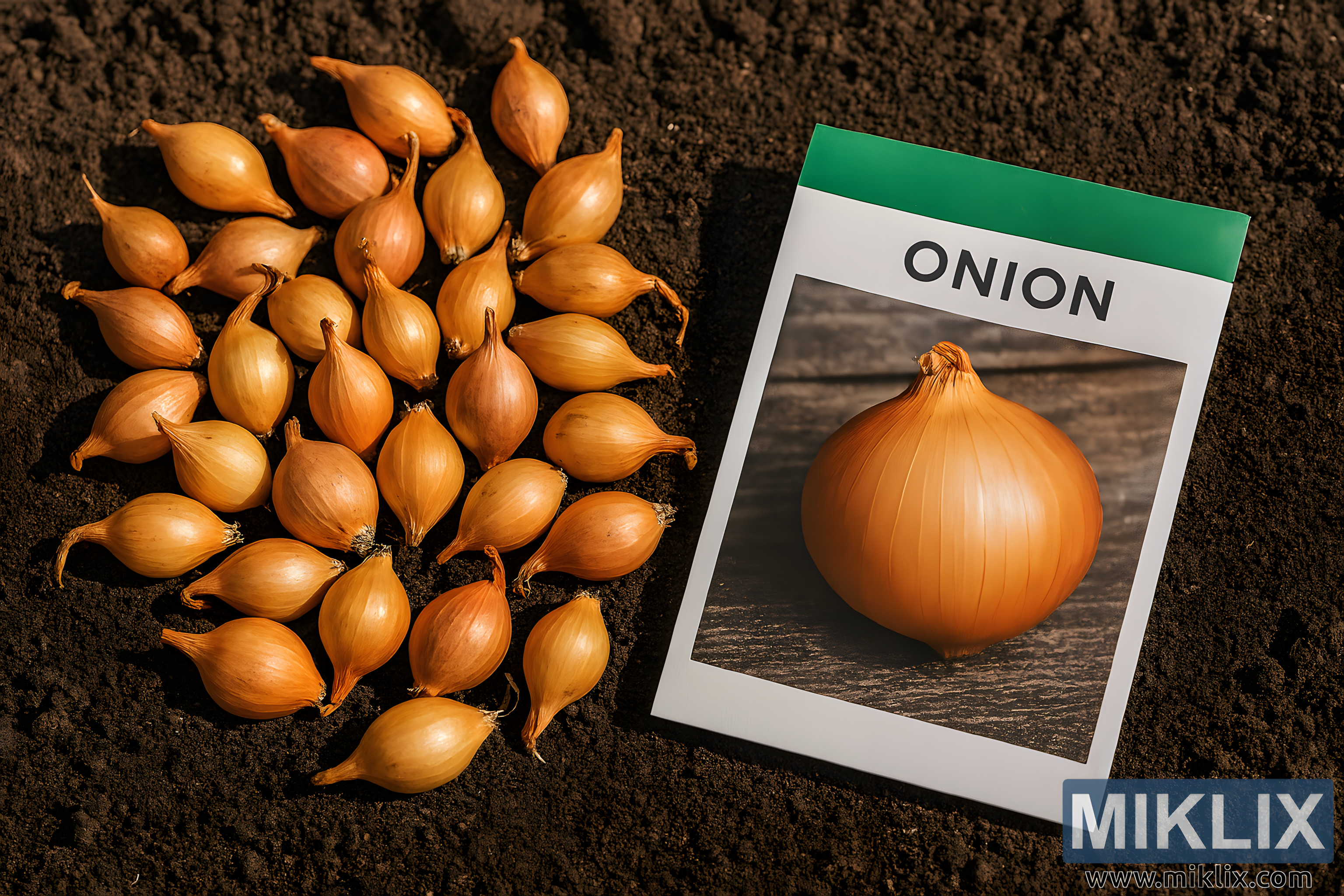 Visokoločljivostna pokrajinska fotografija prikazuje vrtnarjenje s čebulnimi sadikami in vrečko čebulnih semen, razporejenih na sveže obdelani zemlji. Čebulne sadike prevladujejo na levi strani kadra in tvorijo rahel grozd majhnih, nezrelih čebul z zlato rjavo lupino. Njihovi odtenki segajo od bledo rjave do bogate jantarne barve, vsaka čebulica pa ima obliko solze z zaobljenim dnom, ki se zoži proti koničastemu vrhu. Papirnate zunanje lupine so rahlo nagubane in delno prosojne ter lovijo svetlobo z nežnim sijajem. Posušena stebla štrlijo iz vrhov, nekatera so zvita, druga pa ravna, kar doda teksturo in vizualno zanimivost. Dno čebulnih sadikov razkriva drobne, obrabljene ostanke korenin v umazano belih in svetlo rjavih tonih, ki so v nasprotju s temno zemljo pod njimi.