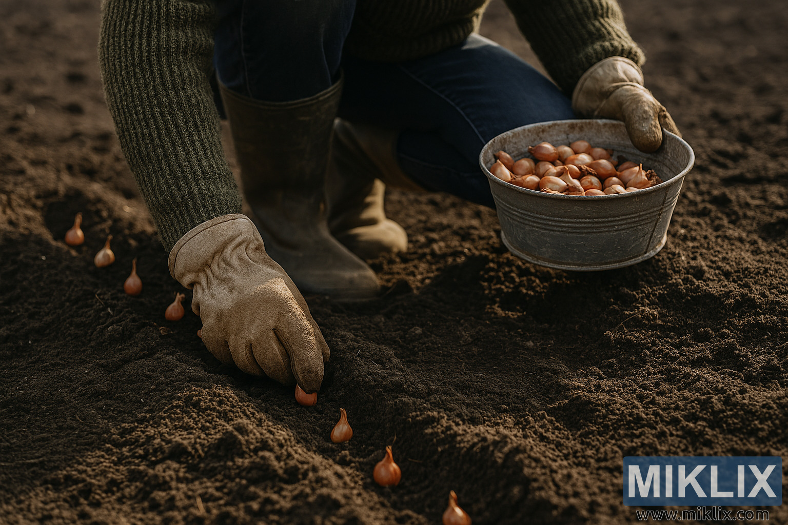 Bližnji posnetek pokrajine vrtnarja, ki sadi čebulne sadike v zemljo zgodaj spomladi, s prikazom realističnih tekstur in sezonskih podrobnosti.