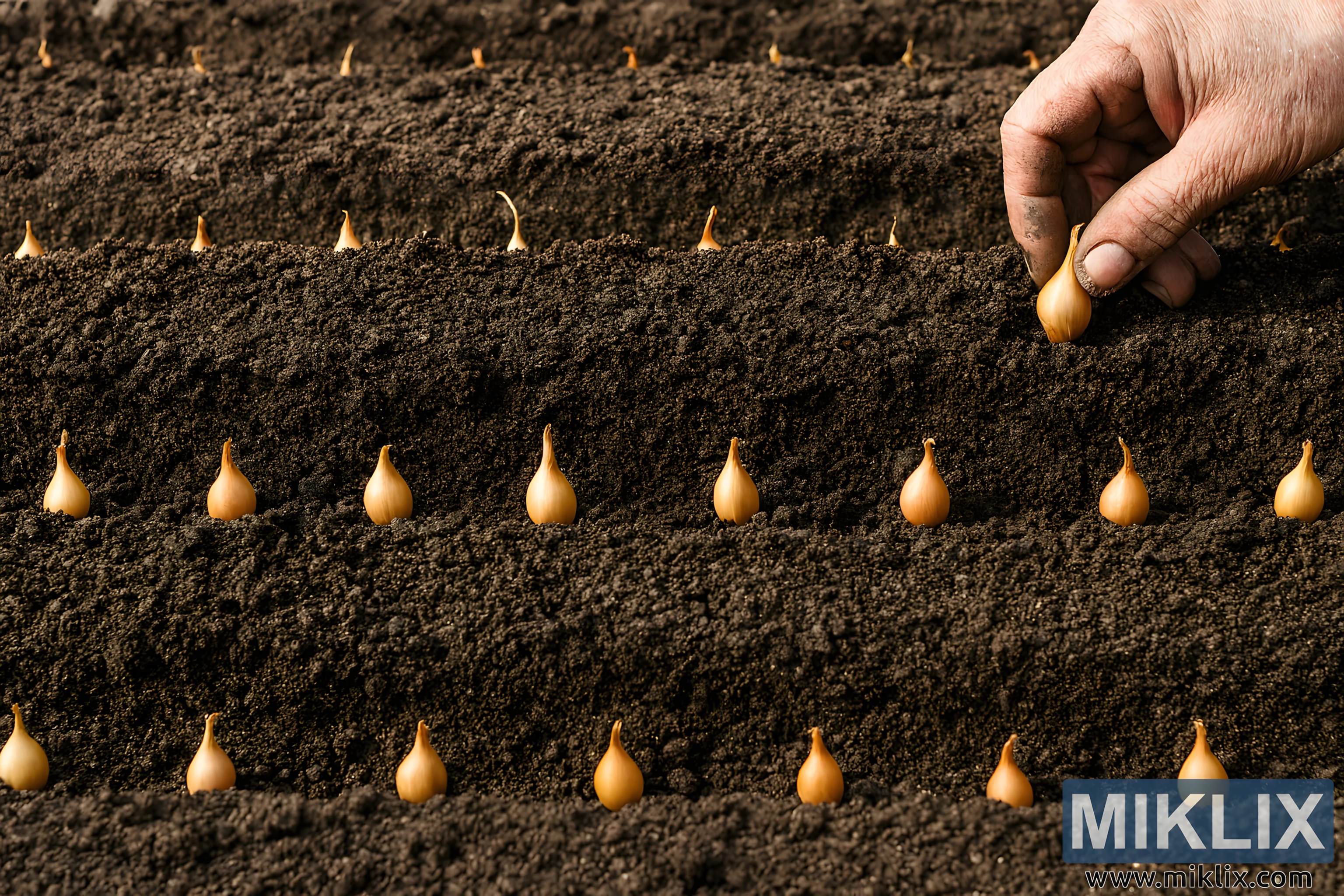 Ta visokoločljivostna pokrajinska fotografija prikazuje postopno demonstracijo sajenja čebulnih sadik v natančno razporejenih vrstah. Slika je bila posneta iz rahlo dvignjenega, bližnjega kota in prikazuje štiri vzporedne brazde sveže obdelane, temno rjave ilovnate zemlje. Vsaka brazda vsebuje enakomerno razporejene čebulne sadike v obliki solze s papirnato zlato rjavo lupino in koničastimi vrhovi, usmerjenimi navzgor. Tekstura zemlje je bogata in zrnata, z vidnimi grudicami in drobnimi delci, ki odbijajo naravno svetlobo, kar poudarja njeno pripravljenost za sajenje.